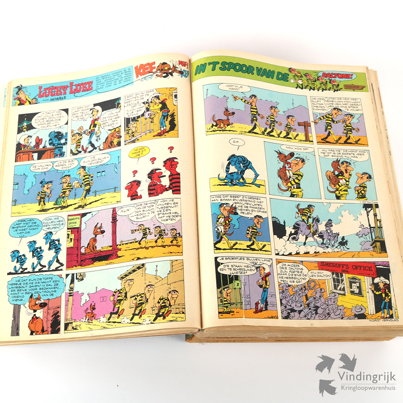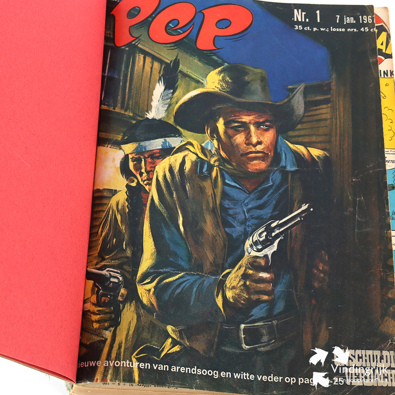 Complete jaargang van het stripweekblad Pep. Het betreft nr 1 t/m 52 uit het jaar 1967. De bladen zijn gebonden in drie banden en bevatten strips als Bonanza, Lucky Luke, Dan Cooper, Asterix, Blake en Mortimer en meer.