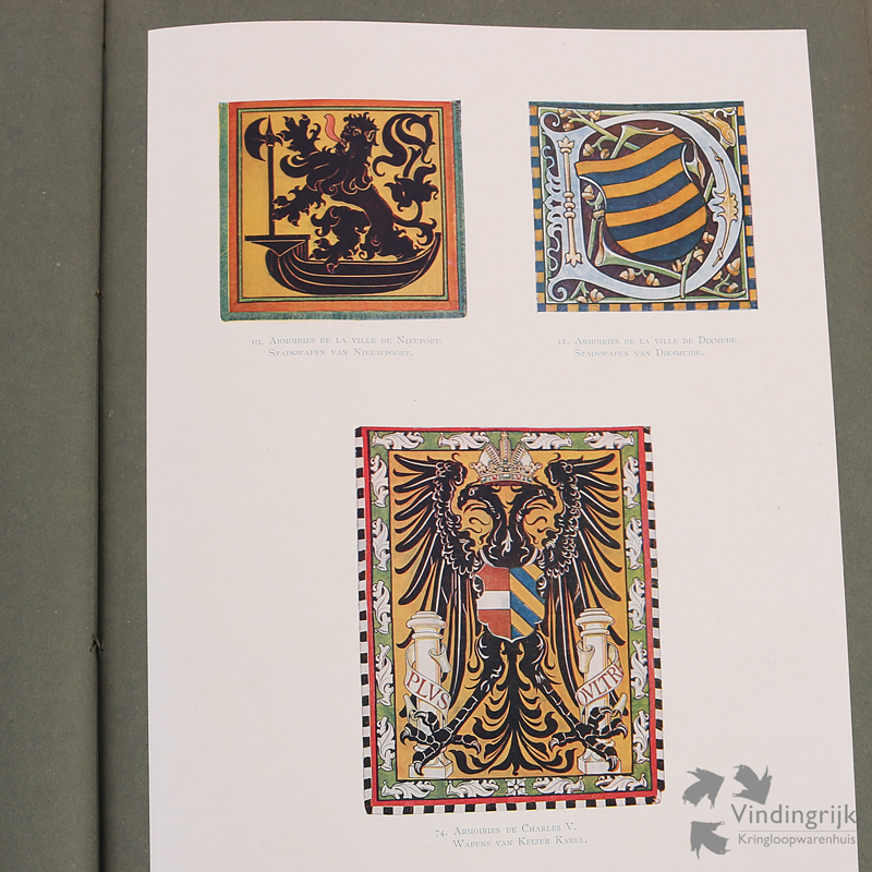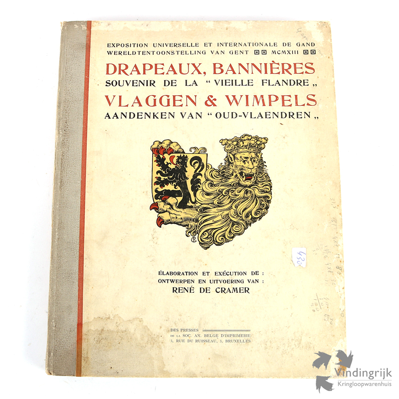 Drapeaux, Bannieres – Souvenir de la ‘Vieille Flandre’ ofwel Vlaggen & Wimpels – Aandenken van “Oud-Vlaendren” is een boek, ontworpen door René de Cramer voor de Wereldtentoonstelling van Gent in 1913. Oud-Vlaenderen was een apart deel van de wereldtentoonstelling. Men trof er 16e- en 17e-eeuwse reconstructies aan van de mooiste gebouwen uit Frans-Vlaanderen, Oost- en West-Vlaanderen, Zeeland en Henegouwen. Het gebonden boek in hardcover telt 12 pagina’s tekst en 40 pagina’s met afbeeldingen in kleur. Dit antieke boek is een uitgave van Soc.anonyme d’Imprimerie, Brussel 1913.