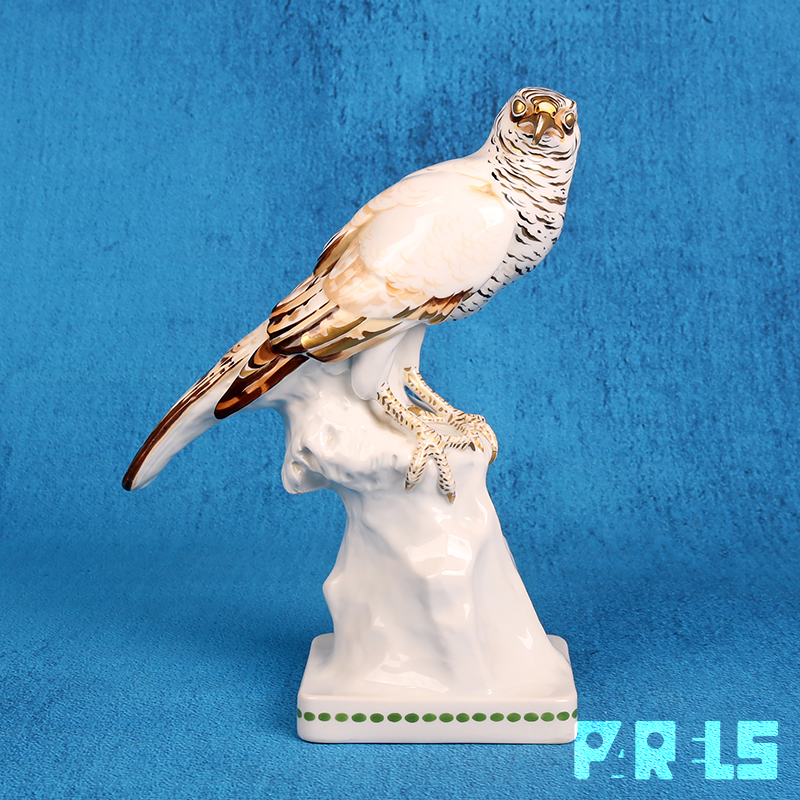 Het betreft een roofvogel, wellicht een havik of valk, mooi gedetailleerd uitgewerkt. Het beeld is met de hand beschilderd in een kleurencombinatie van zwart, diverse bruintinten en prachtige goudaccenten.