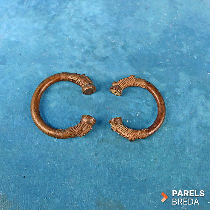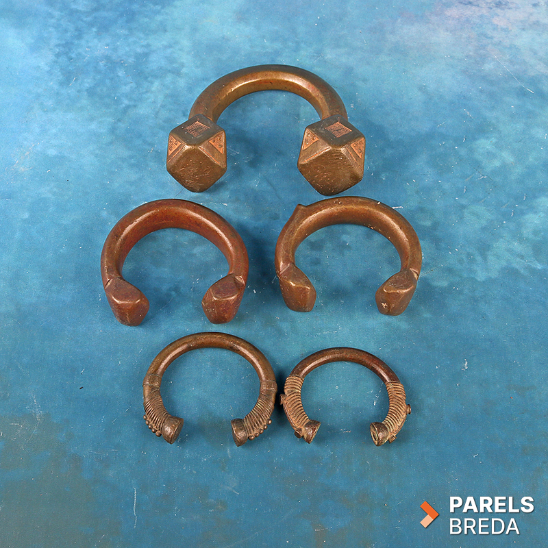 De set bestaat uit 5 armbanden die werden Gebruikt tussen de 15e en 20e eeuw als officieel betaalmiddel in West-Afrika voor de handel in kostbare goederen. Elke Manilla heeft zijn eigen unieke patina en textuur, gevormd door decennia aan geschiedenis en gebruik.