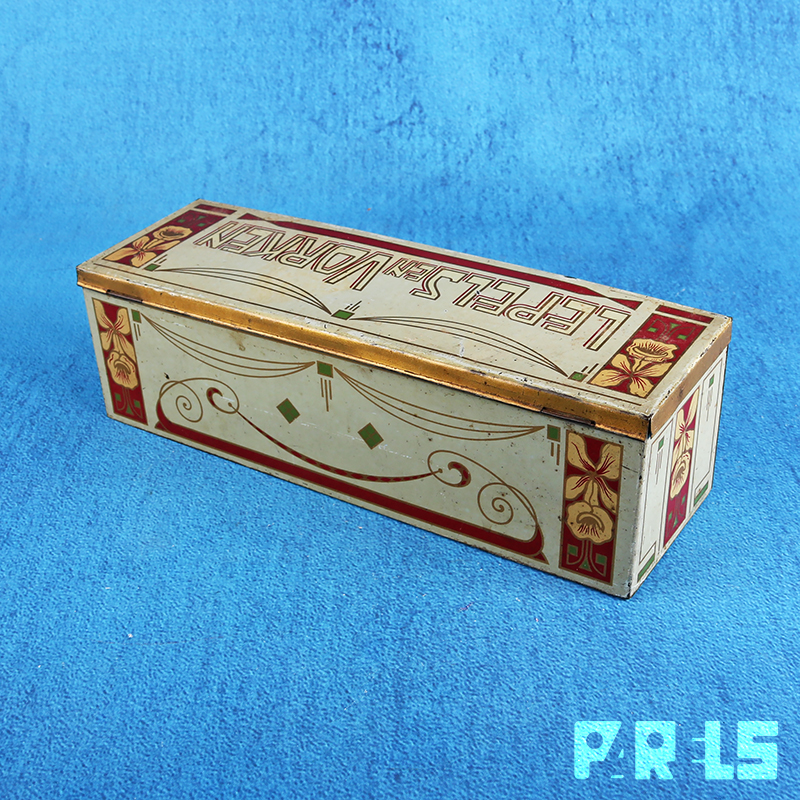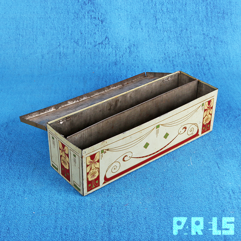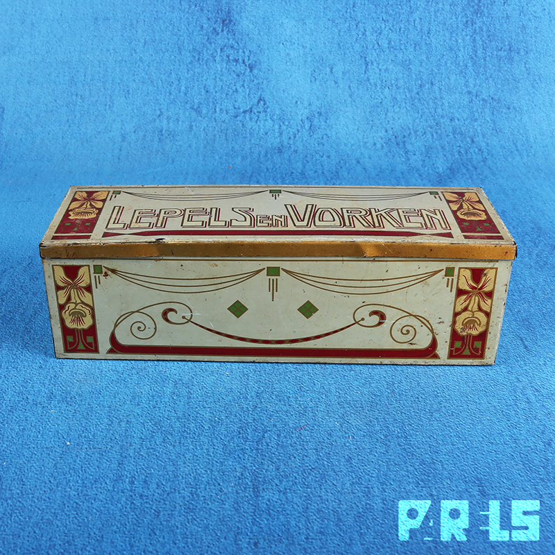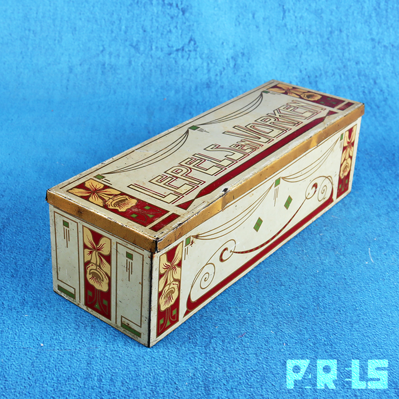 Het betreft een langwerpig gelithografeerd blik in diverse kleuren met goudaccenten.