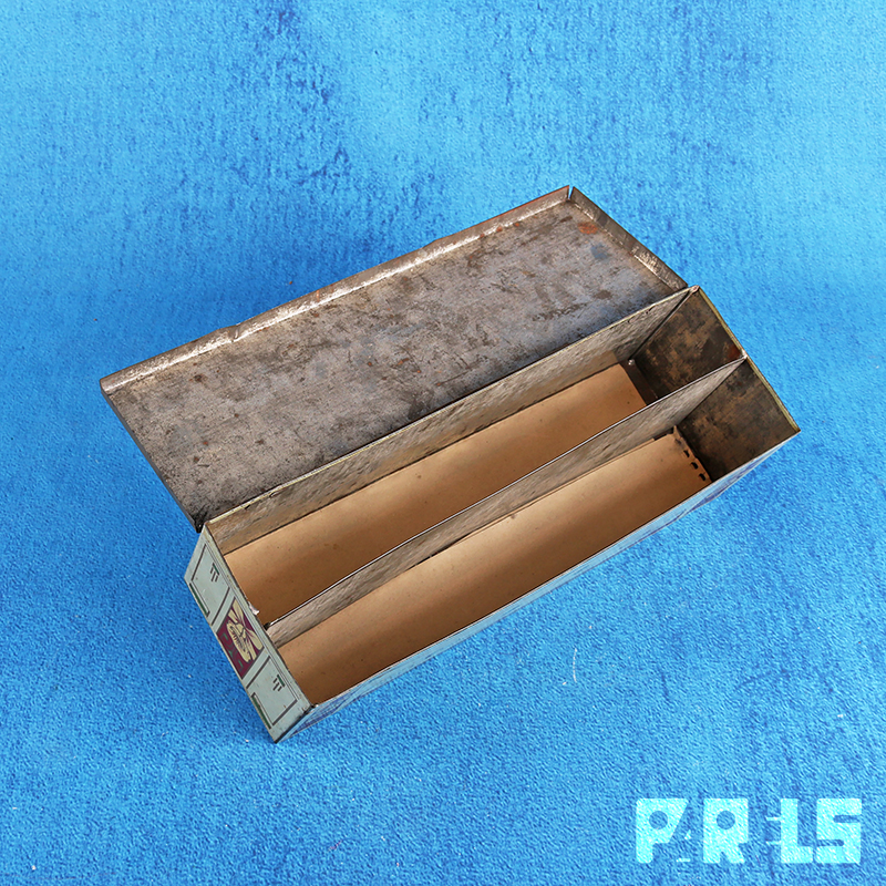 Het blik heeft binnenin een tussenschot om de lepels en vorken te scheiden en het is gemaakt tussen circa 1890 en 1920.