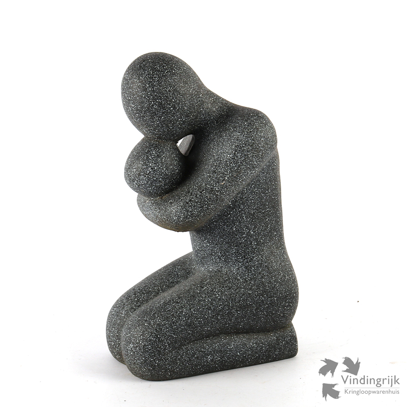 Gestileerd beeld van een moeder met kind. Het beeld is gegoten van gips en de buitenkant is bewerkt met fijnkorrelig materiaal in granietkleur.