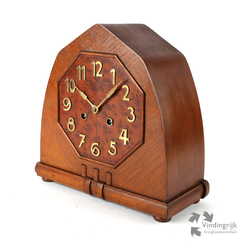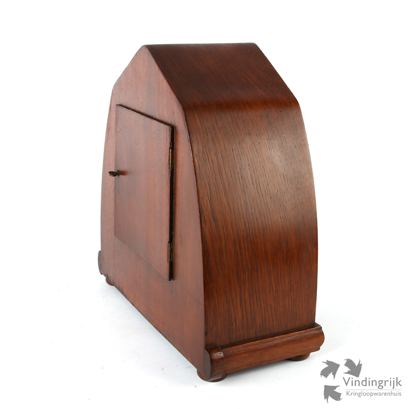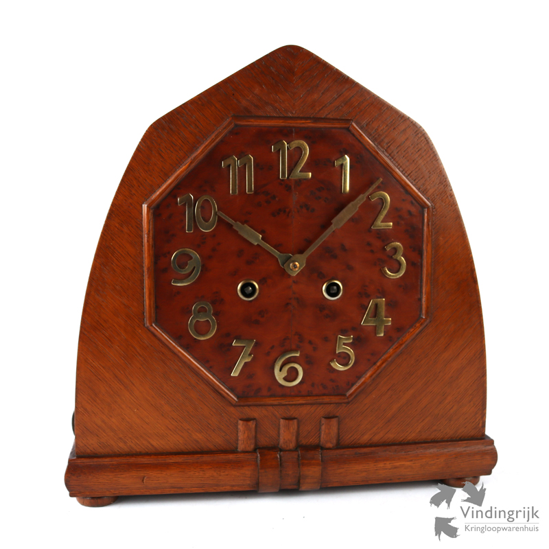 Tafelklok in de stijl van de Amsterdamse School. Deze prachtige Art-Deco klok dateert van omstreeks 1930. De wijzerplaat met uur-aanduiding heeft messing cijfers en de ombouw is gemaakt van hout in zeer fraaie vormgeving. Let op: De klok loopt niet! Het opwindmechanisme is defect. Het slagwerk geeft nog wel geluid bij het handmatig verplaatsen van de wijzers.