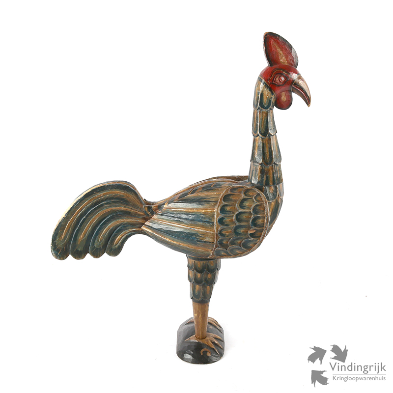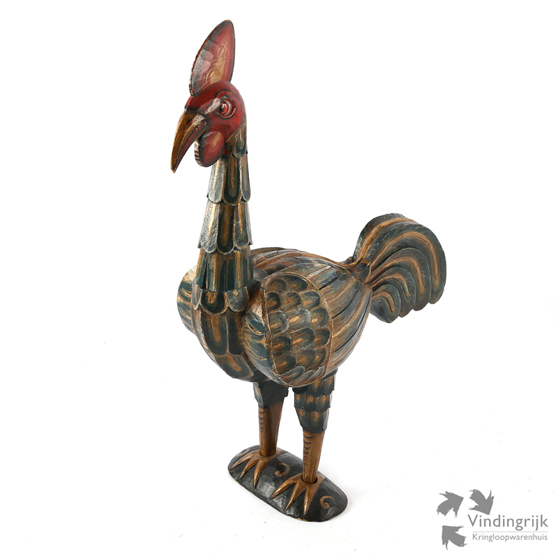 Grote haan, gemaakt van hout. De haan is gedecoreerd met houtsnijwerk en fraai beschilderd in de kleuren rood, groen, bruin en zwart met accenten in goudkleur. De nek met kop kan ook andersom op de romp worden gezet.
