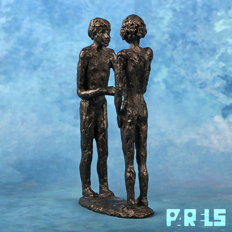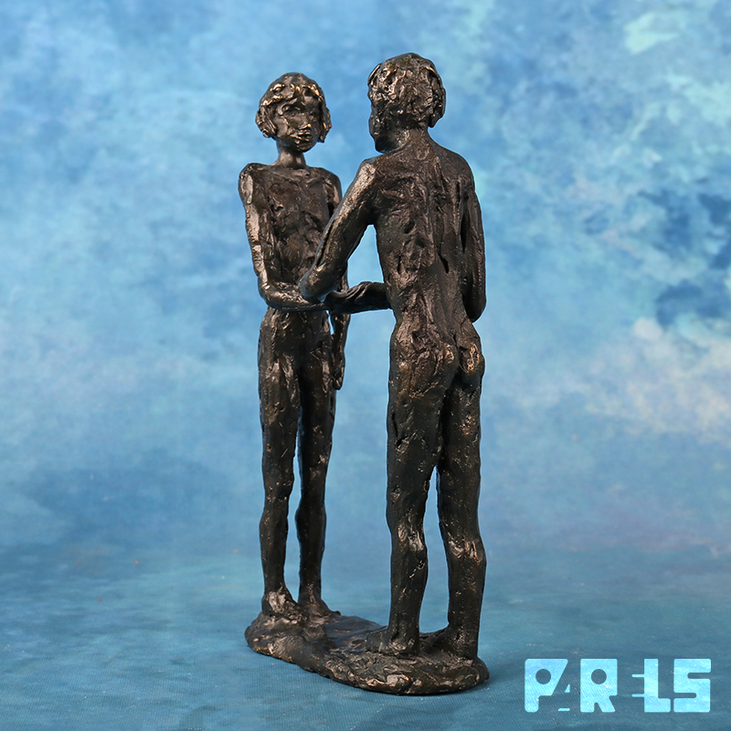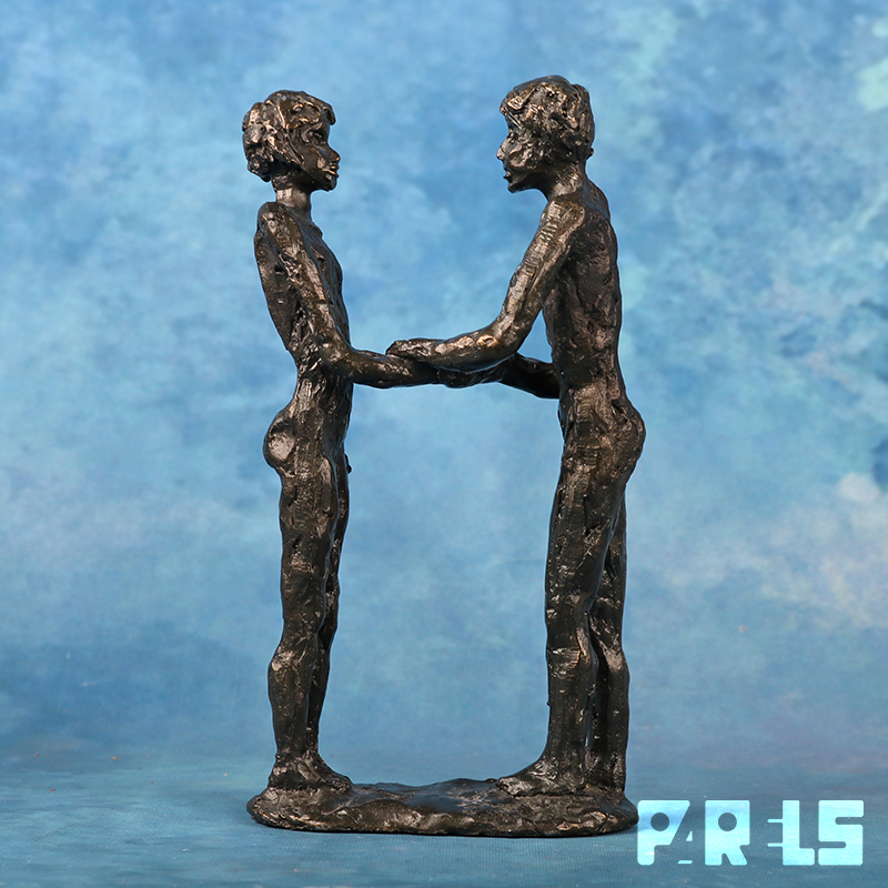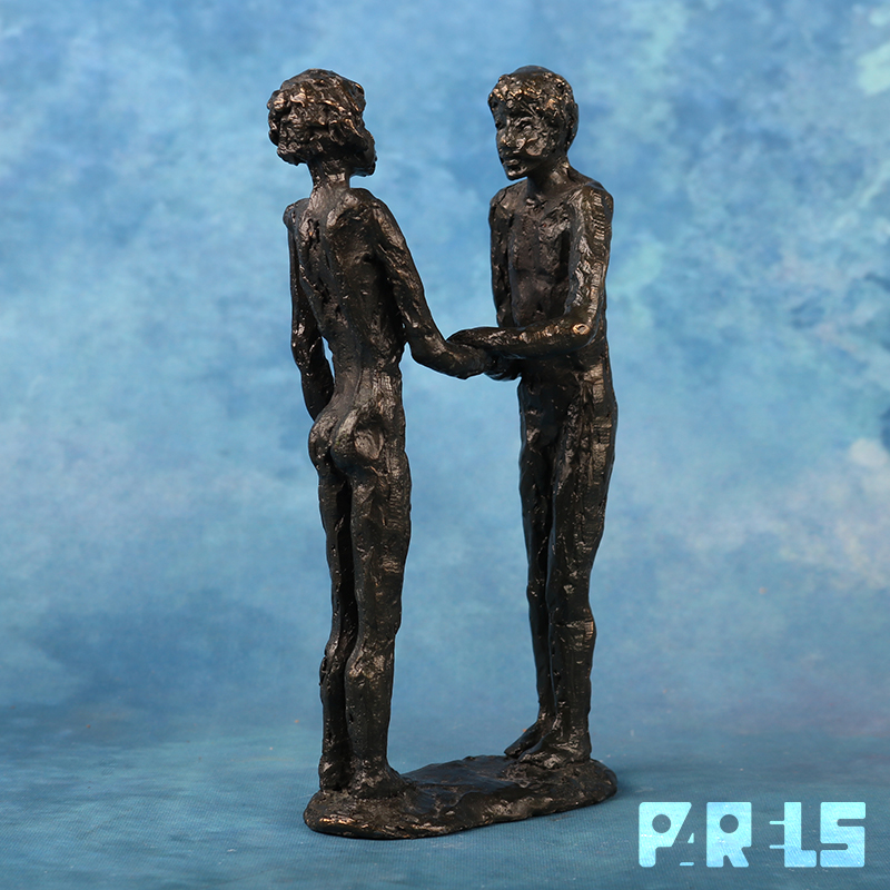 Het beeld toont twee staande figuren die elkaar bij de hand vasthouden.