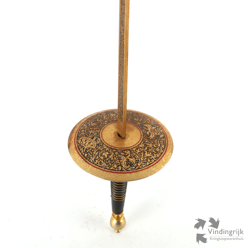 Het handvat is goudkleurig en gedecoreerd met sierlijke details.