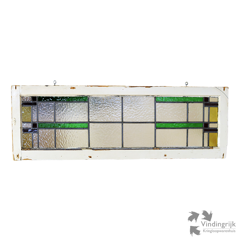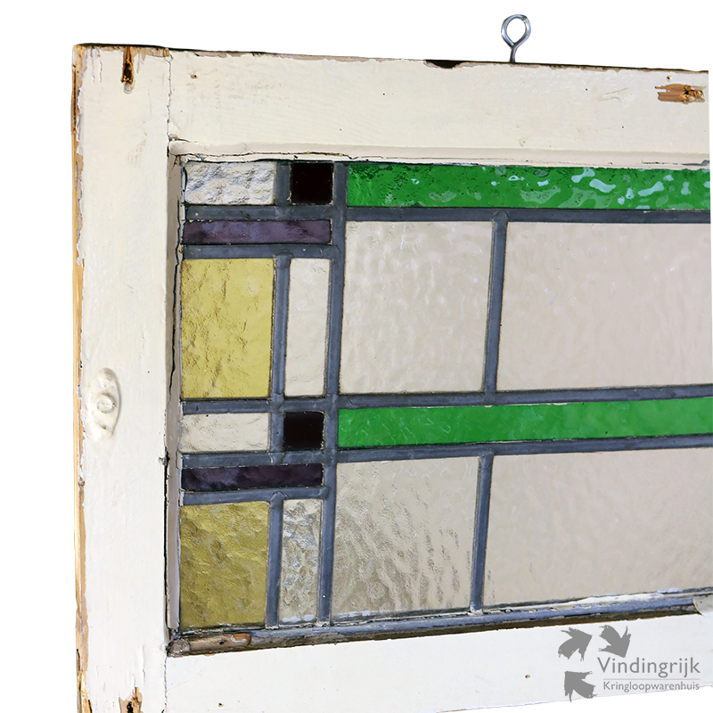 Mooi glas in Loodraam in een houten omlijsting. Het kathedraalglas (Kathedraalglas is afgeleid van gewalst glas. Het heeft aan een kant een fijne structuur, waardoor het niet helemaal transparant is) is gekleurd in rood, groen, paars en geel met ongekleurd middenstuk.