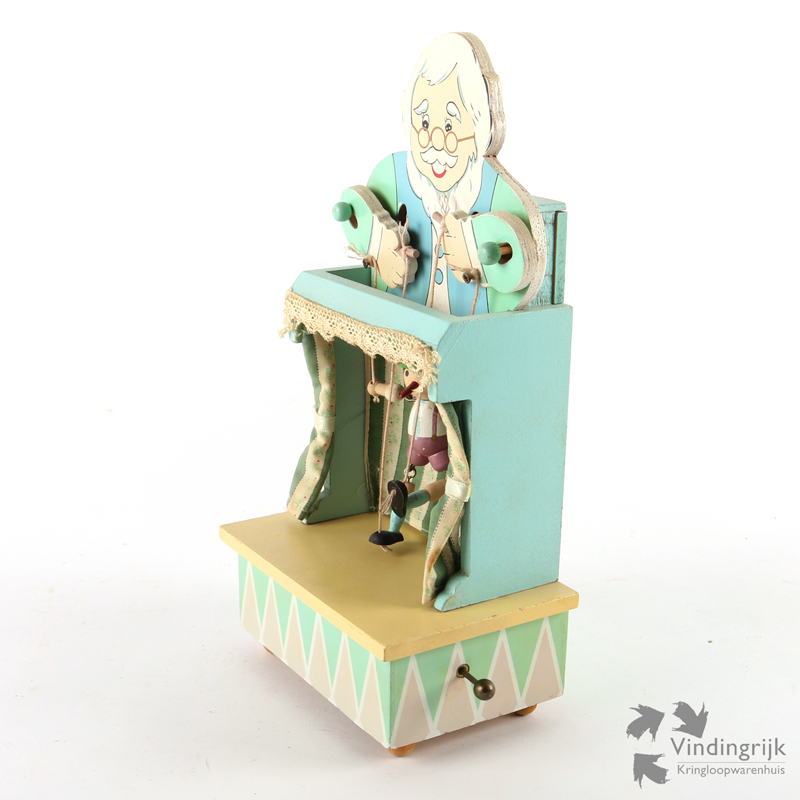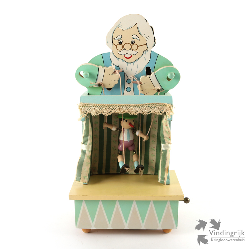 Zijn maker, de houtbewerker Geppetto beweegt de touwtjes waardoor Pinokkio gaat bewegen.