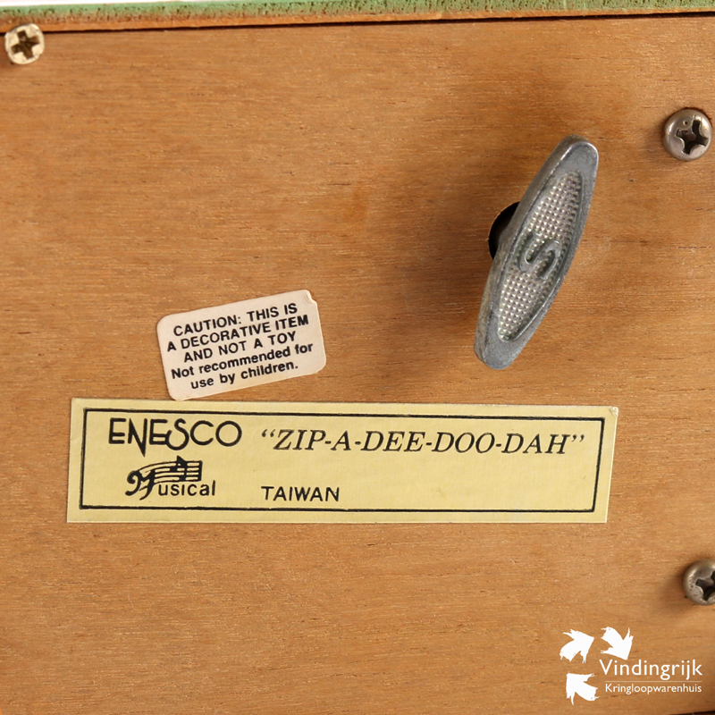 De muziekdoos is van het merk Enesco musical en is gemaakt in Taiwan.