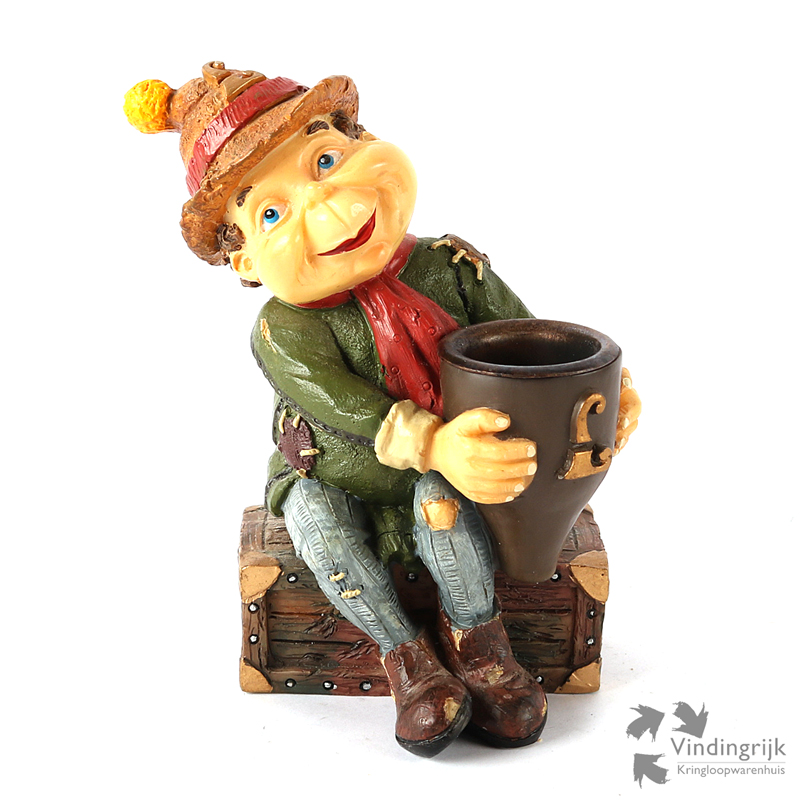 Kaarsenhouder in de handen van een laaf gezeten op een zeepkist.