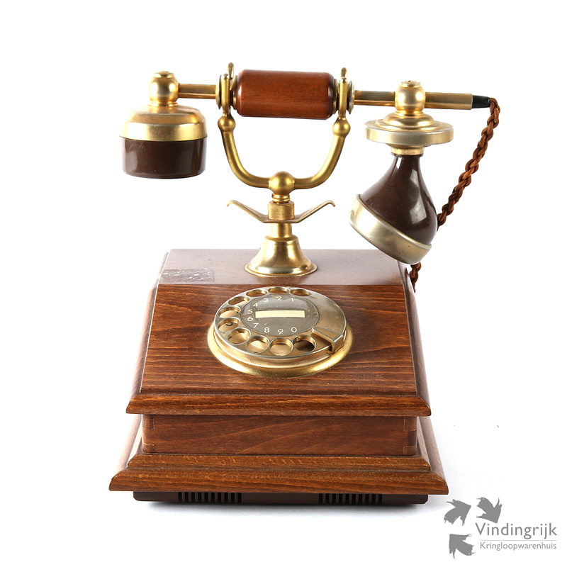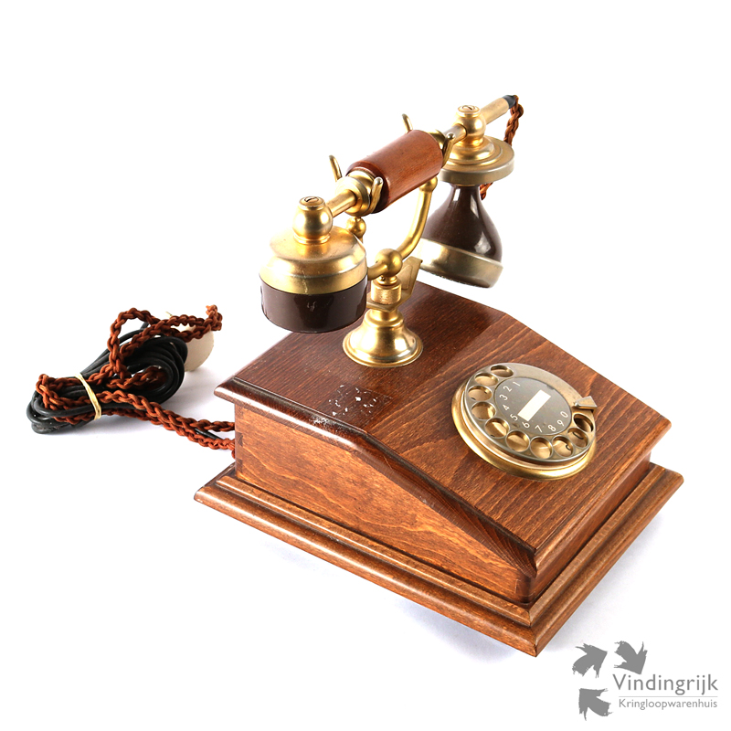 Telefoon in klassieke vormgeving. Op de koperen haak ligt een hoorn met ouderwets spreekgedeelte. De houten ombouw heeft een nieuw binnenwerk. Er kan wel mee gebeld worden via een oude aansluiting, maar bij gebeld worden klinkt geen signaal. Het betreft derhalve in eerste instantie een decoratief artikel.