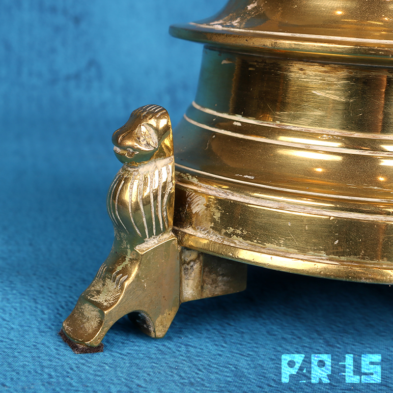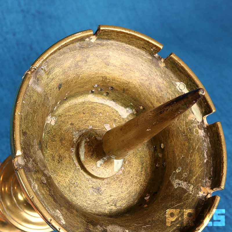 Voorzien van 3 kleine leeuwen als pootjes. Bovenop zit een pin zodat de kandelaar geschikt is voor het plaatsen van een dikke kaars.