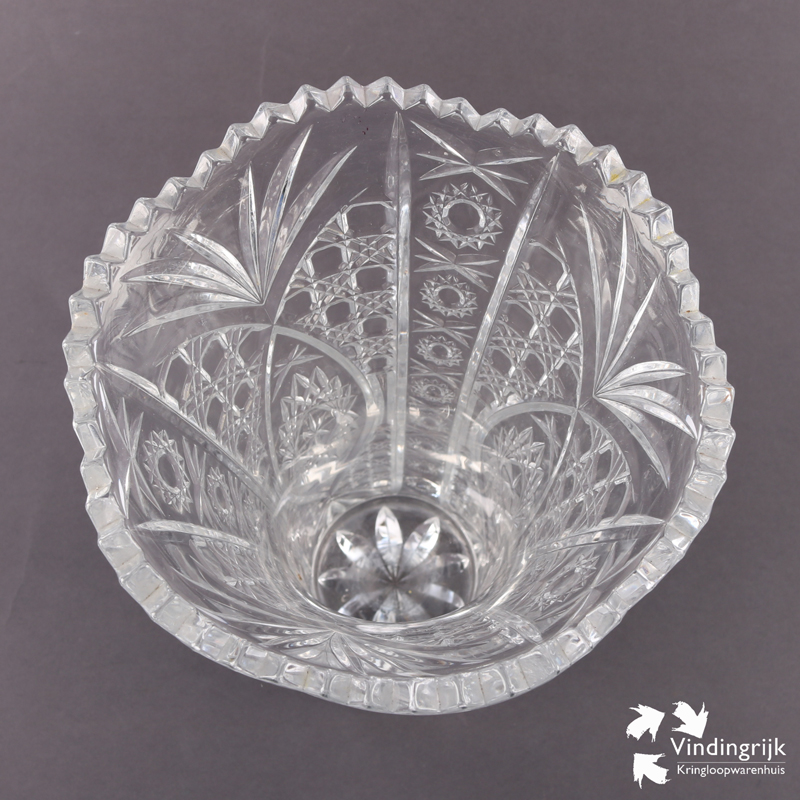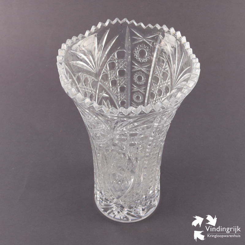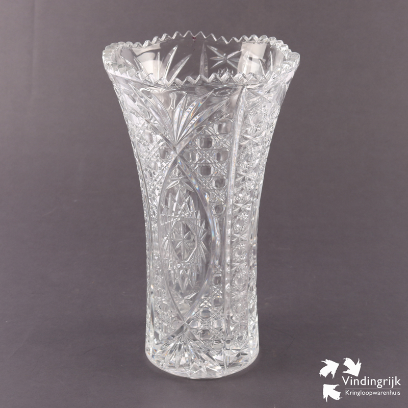 De vaas is van degelijk dik kristal en is rijkelijk uitgevoerd met mooie figuren in reliëf.