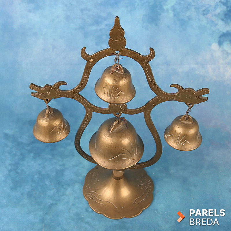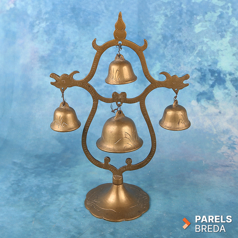 Decoratieve messing bellenstandaard met vier afzonderlijke bellen aan een sierlijk, symmetrisch frame. De bellen zijn gegraveerd. Geeft een helder, hoog geluid. Herkomst: te plaatsen binnen de Aziatische traditie van messing bell stands of bell trees, veelal decoratieve exportstukken geïnspireerd op tempelbellen uit regio’s zoals China, India en Nepal (20e eeuw).