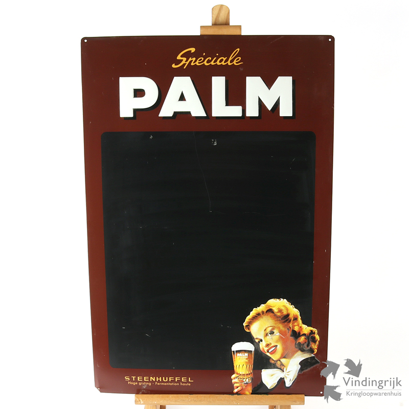 Hier een metalen reclamebord voor Speciale Palm, met de afbeelding van een jongedame in reliëf die het glas heft. De witte letters zijn ook in reliëf weergegeven.