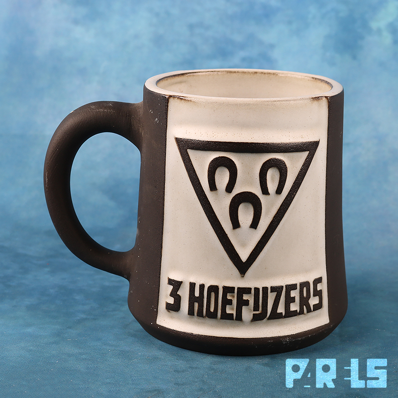 Aan de ene zijde de leuke gestileerde afbeelding van de pater in reliëf, aan de andere zijde het logo van brouwerij de 3 Hoefijzers te Breda, tevens in reliëf uitgevoerd.