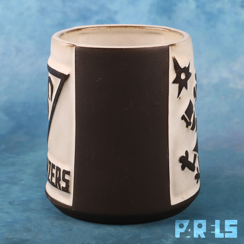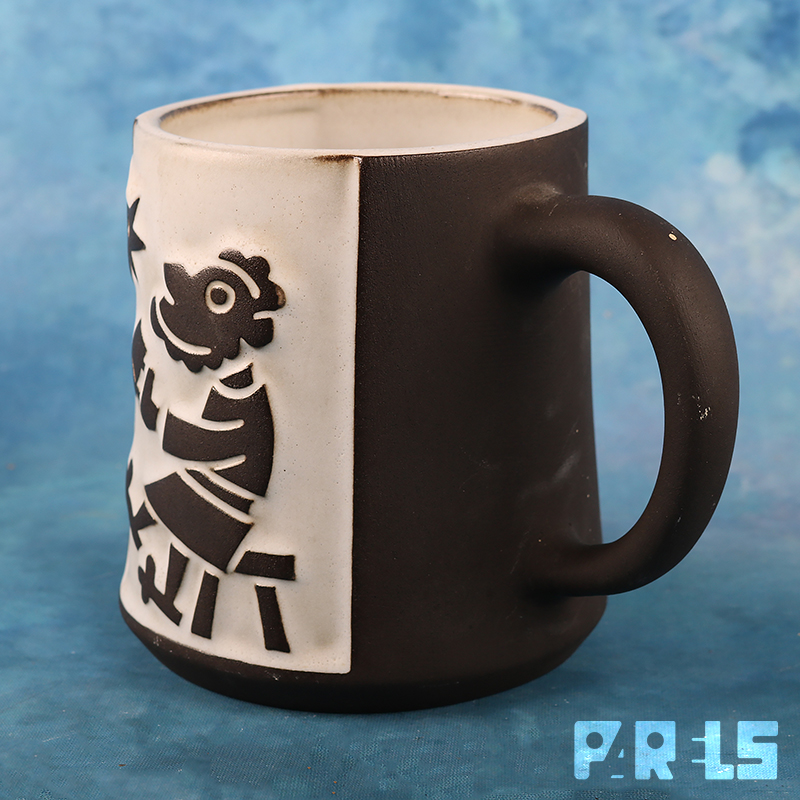 Aardewerken beker/mok, met voorstelling “Pater”. Het ontwerp is van Jaap Ravelli, uitgevoerd door Potterij Ravelli in 1955.