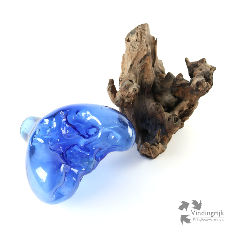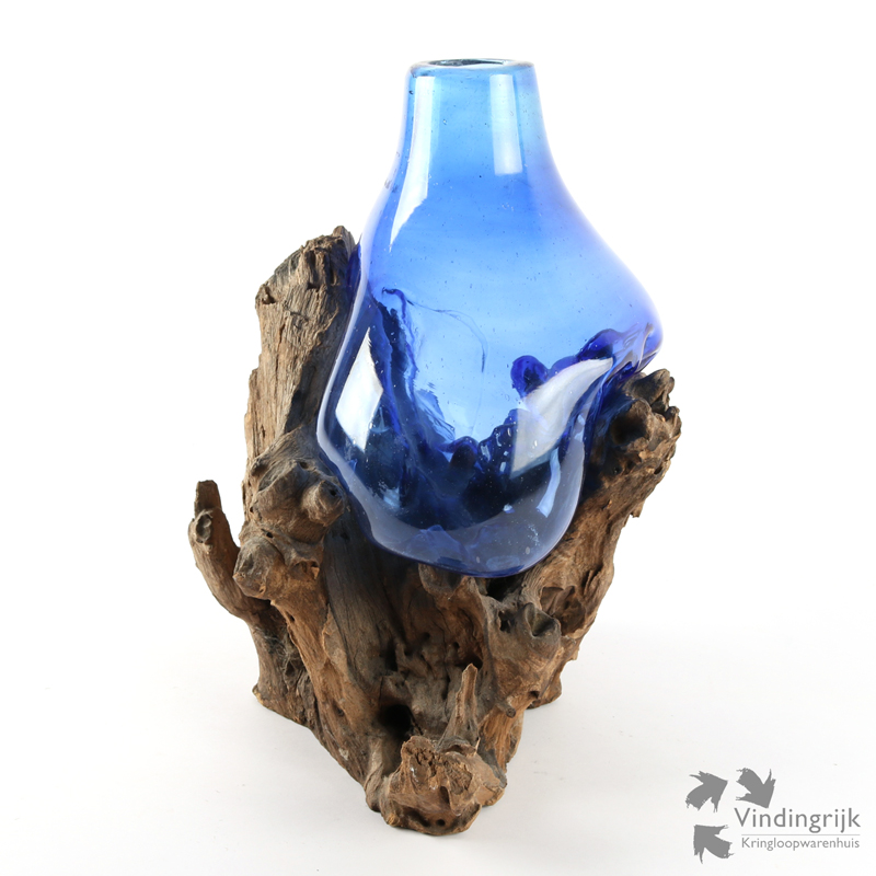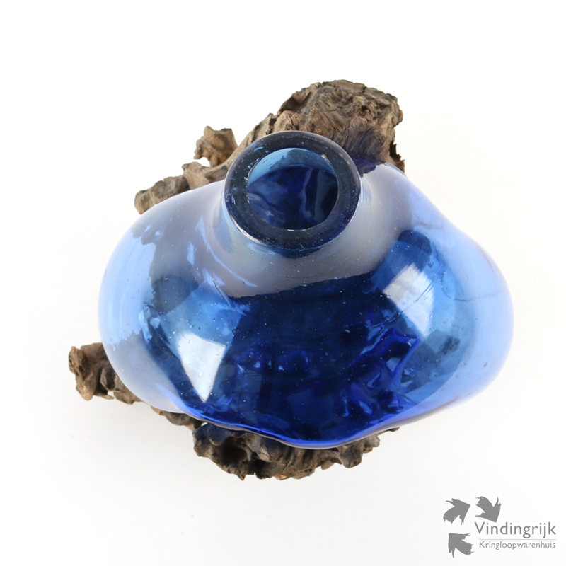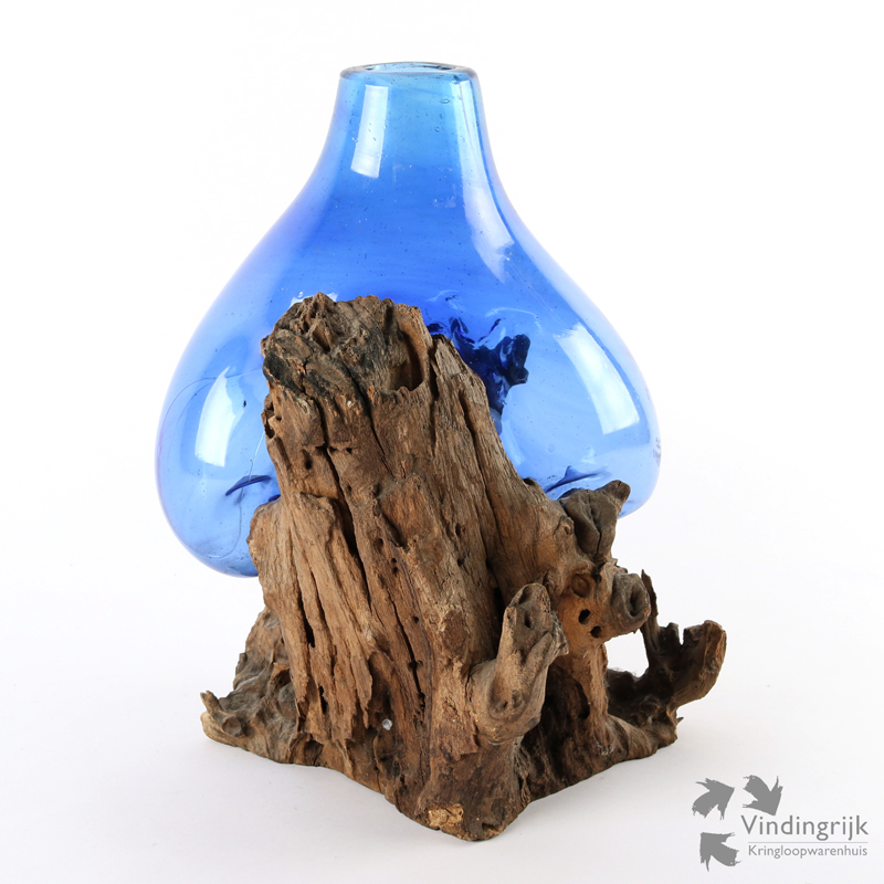 Het blauwe glas van deze druppelvaas is mondgeblazen, het wordt op een temperatuur van rond de 1250 graden op het hout geblazen. Hierdoor is de pasvorm perfect, en is er een unieke twee-eenheid tussen hout en glas gecreëerd. Het glas is, doordat het mondgeblazen is, niet vrij van luchtbelletjes.