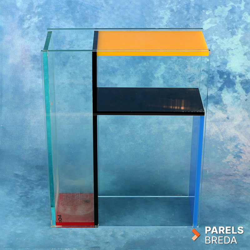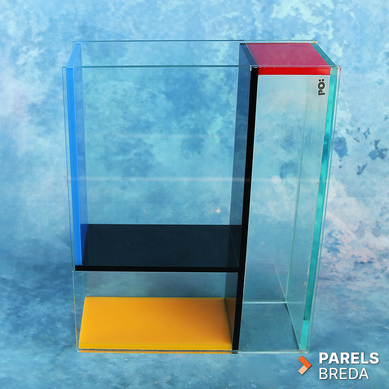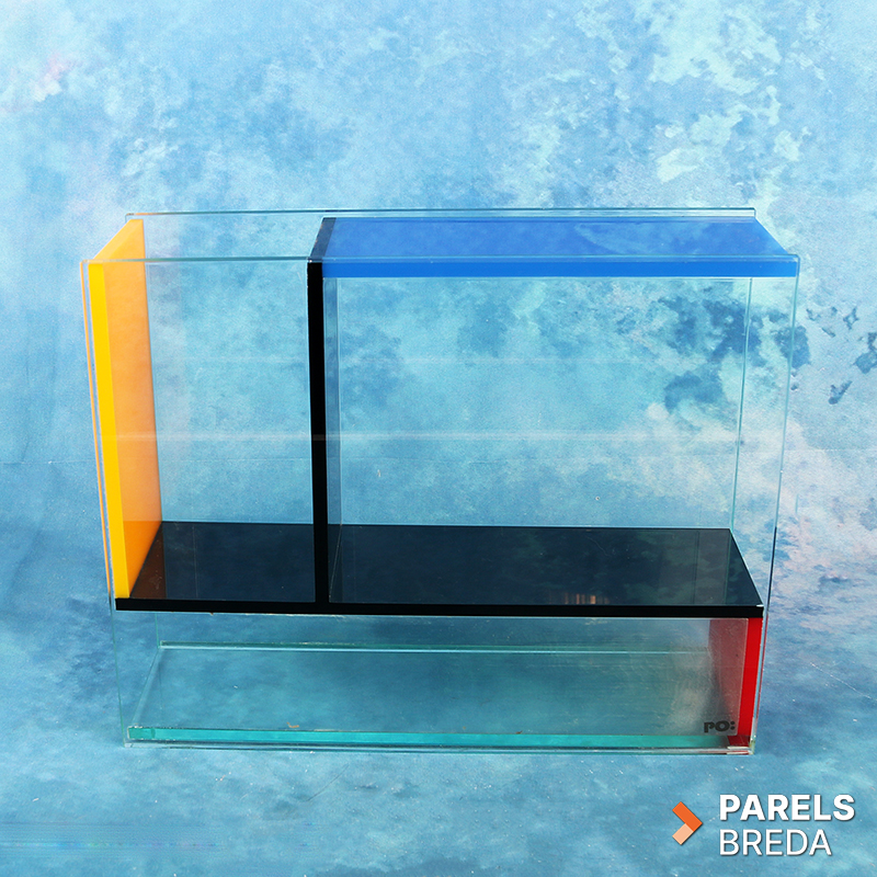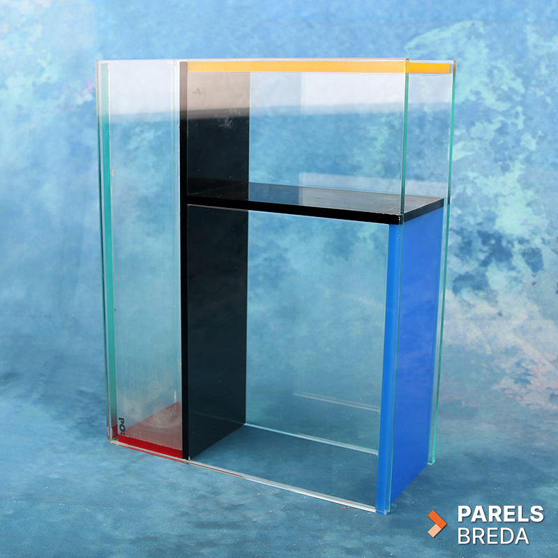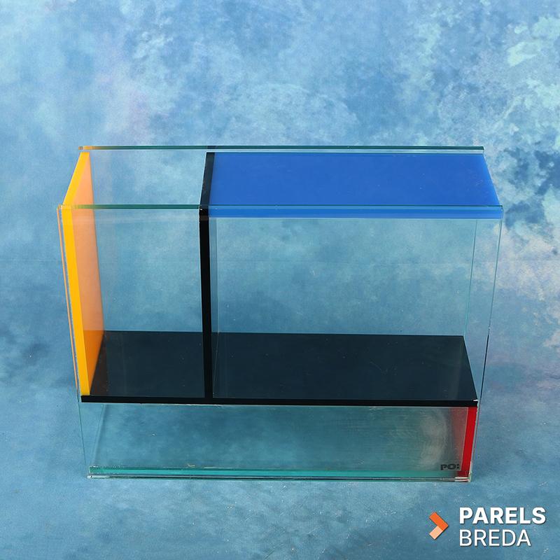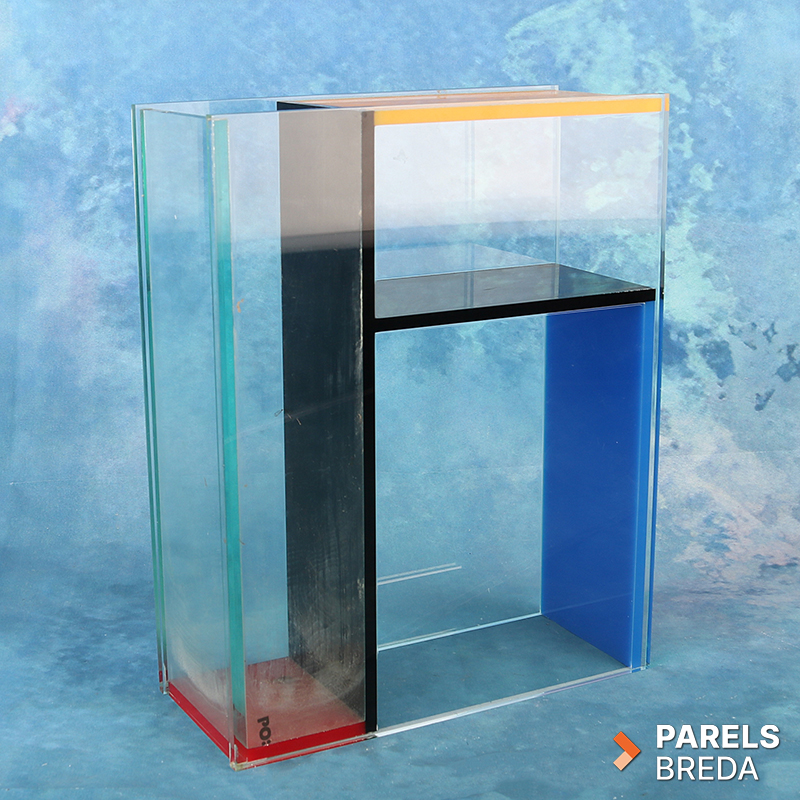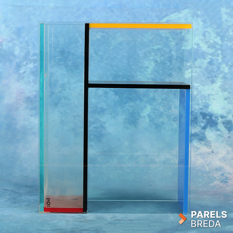 Mondri Vase ontworpen door Frank Kerdil voor PO: Selected, uitgevoerd in transparant plexiglas met kleurvlakken in primaire tinten. De vaas is opgebouwd uit drie compartimenten die door de constructie in verschillende posities gebruikt kunnen worden. De heldere wanden en strakke geometrie zorgen voor een ruimtelijke uitstraling. Het geheel is vervaardigd uit plexiglas en vertoont lichte gebruikssporen zoals kalkaanslag, zonder invloed op de functionaliteit, dit kan nog verwijderd worden. De vormgeving is stabiel, strak en geschikt als decoratief object of als functionele bloemenvaas.