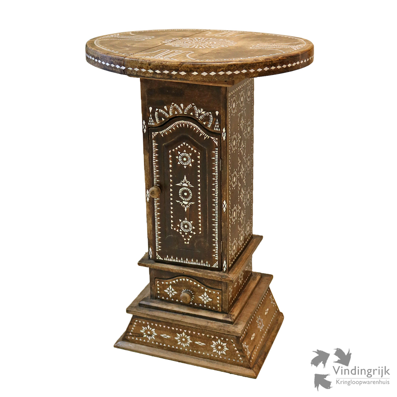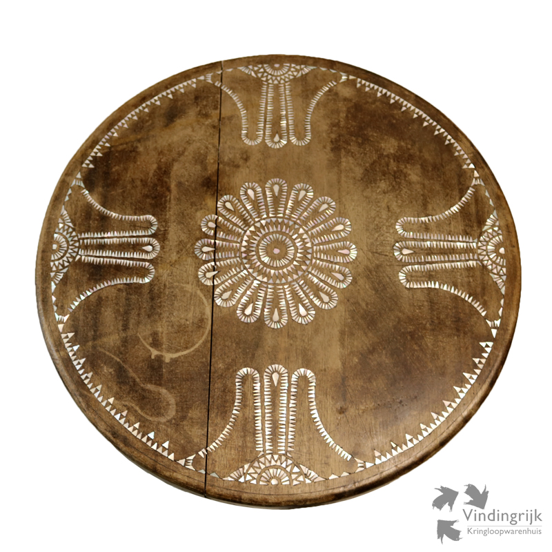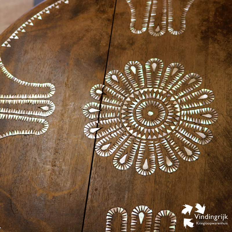 De tafel is rondom zeer rijkelijk gedecoreerd met ingelegde stukjes parelmoer in fraaie patronen.