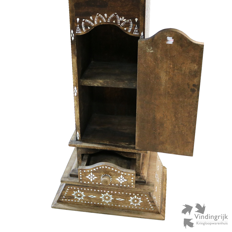 Onder het blad is opbergruimte voorzien, een vak met deurtje en een lade.