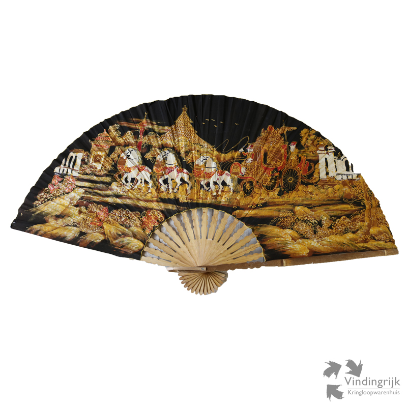 Grote waaier, gemaakt van stof. De waaier heeft een afbeelding van een kleurrijk tafereel met koets en paarden.