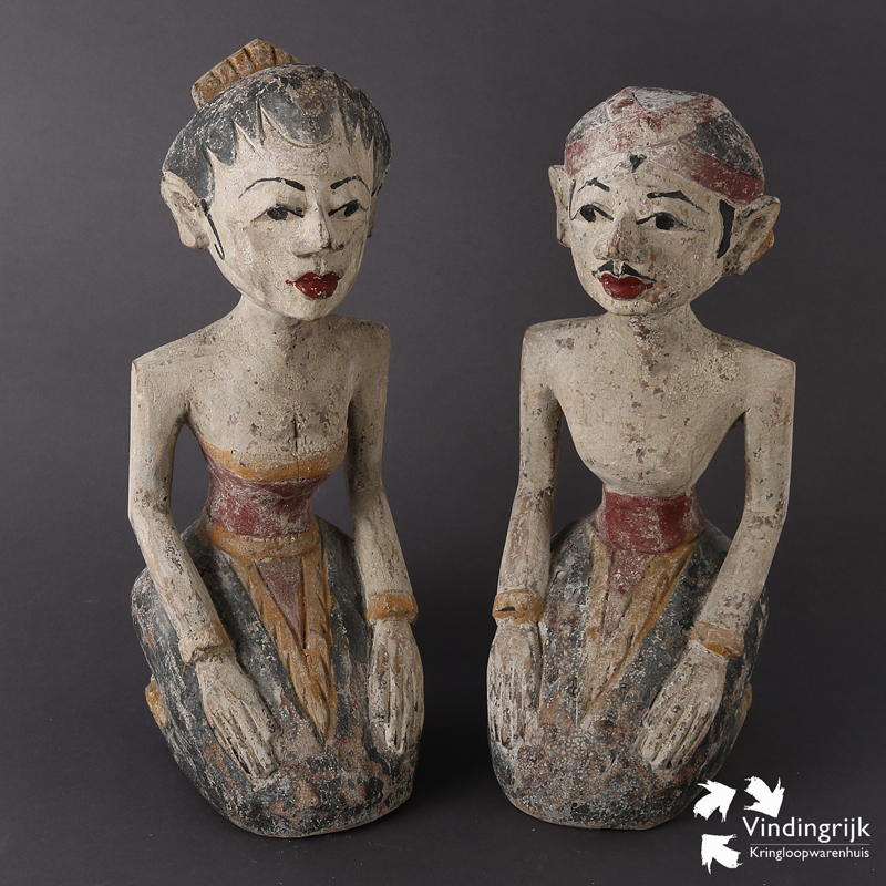 Twee beelden, met de hand gemaakt uit tropisch hardhout. De beelden zijn beschilderd en hebben de dracht van Java. De beelden hebben waarschijnlijk buiten gestaan, waardoor de buitenkant verweerd is. Desalniettemin zijn de beelden nog immer zeer decoratief te noemen.