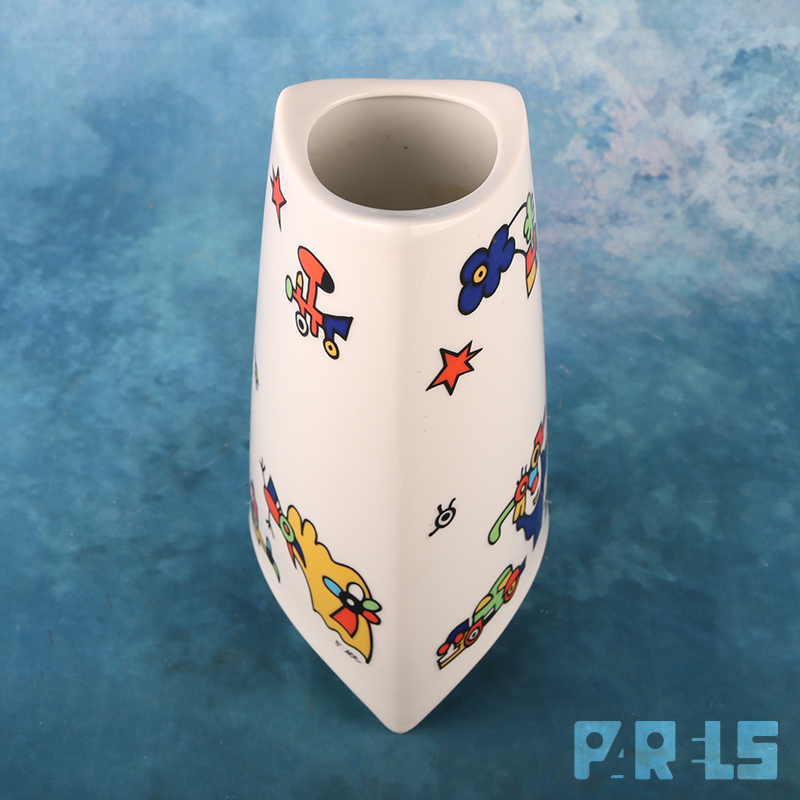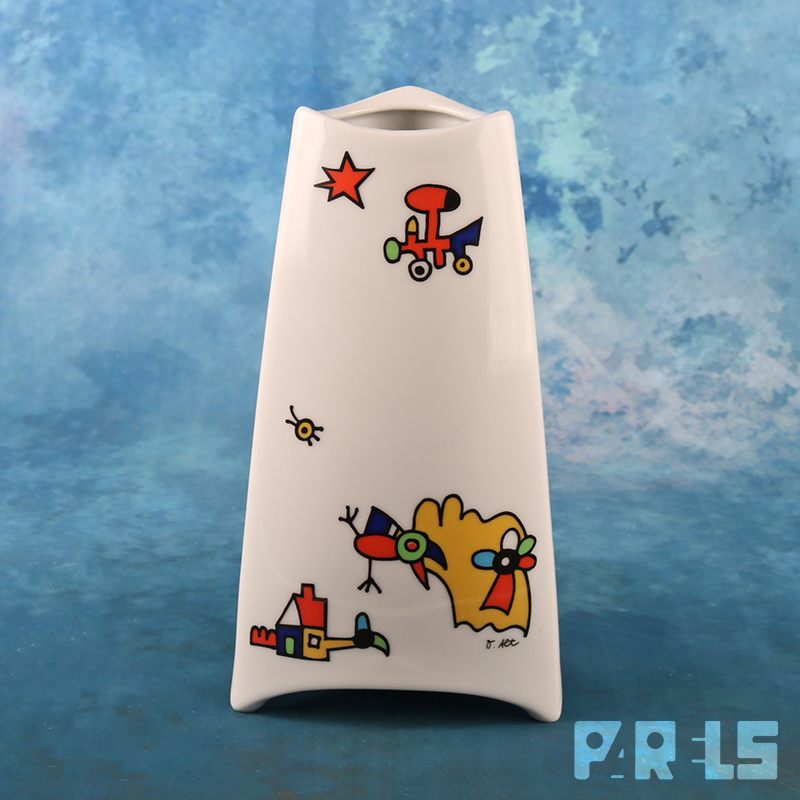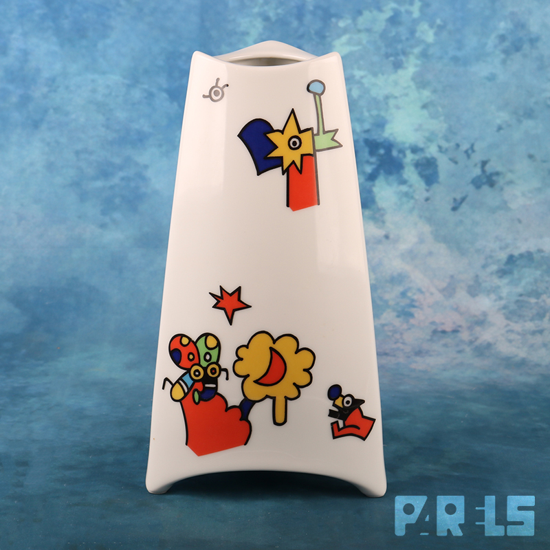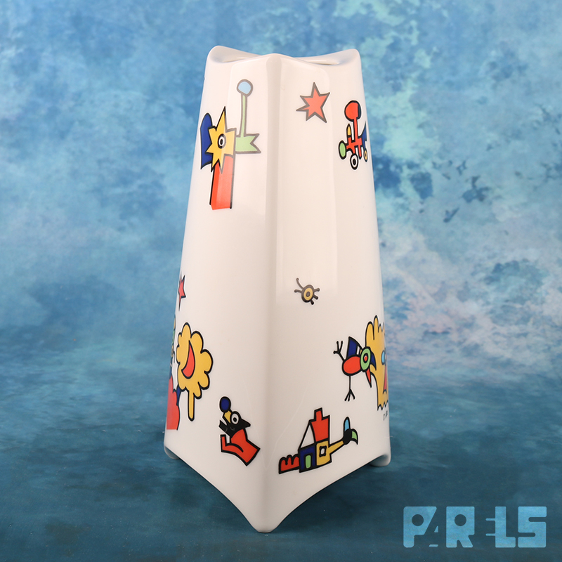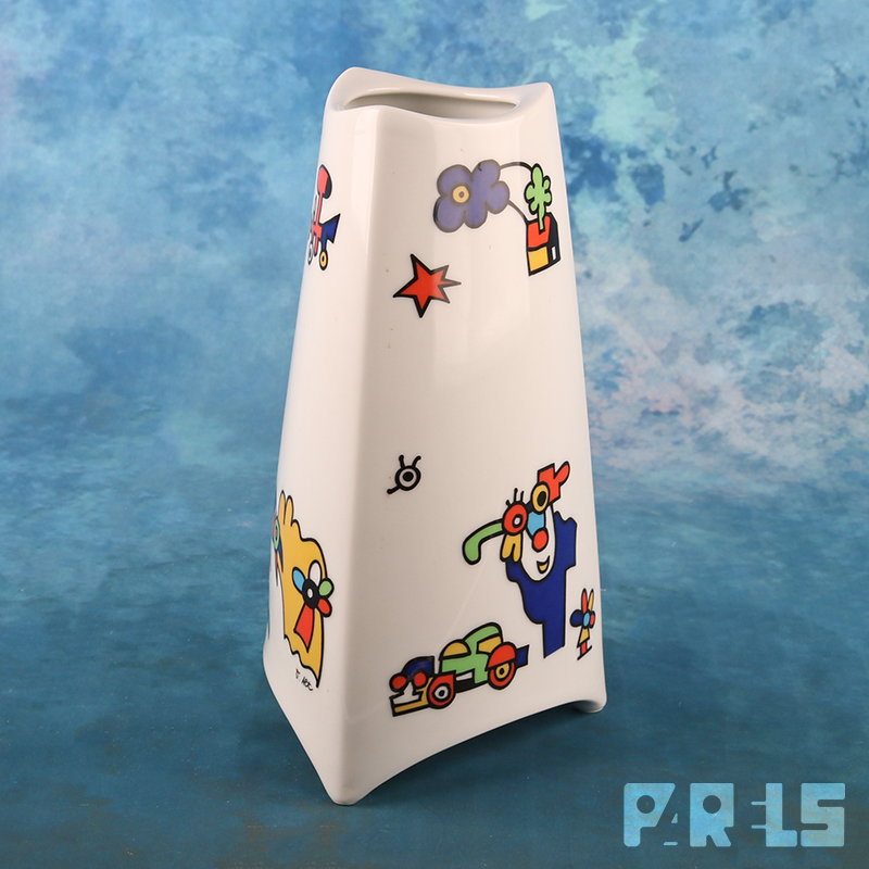 “Flash Funny People” vaas ontworpen door de Duitse kunstenaar Otmar Alt voor het bekende merk Rosenthal. De porseleinen vaas maakt deel uit van een bredere serie servies en decoratieve items met de naam “Flash” en het thema “Funny People”. De collectie is herkenbaar aan de felle kleuren en de speelse, abstracte figuren die typerend zijn voor het werk van Otmar Alt.