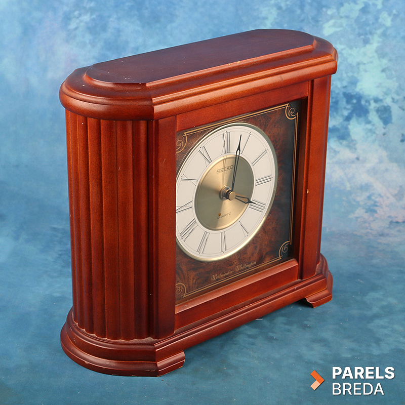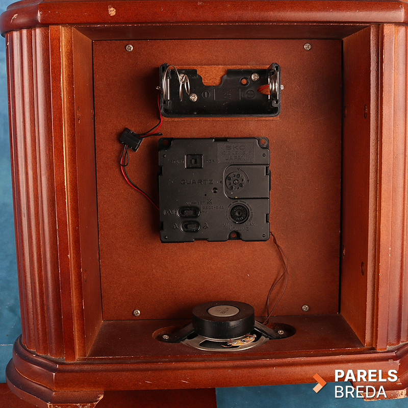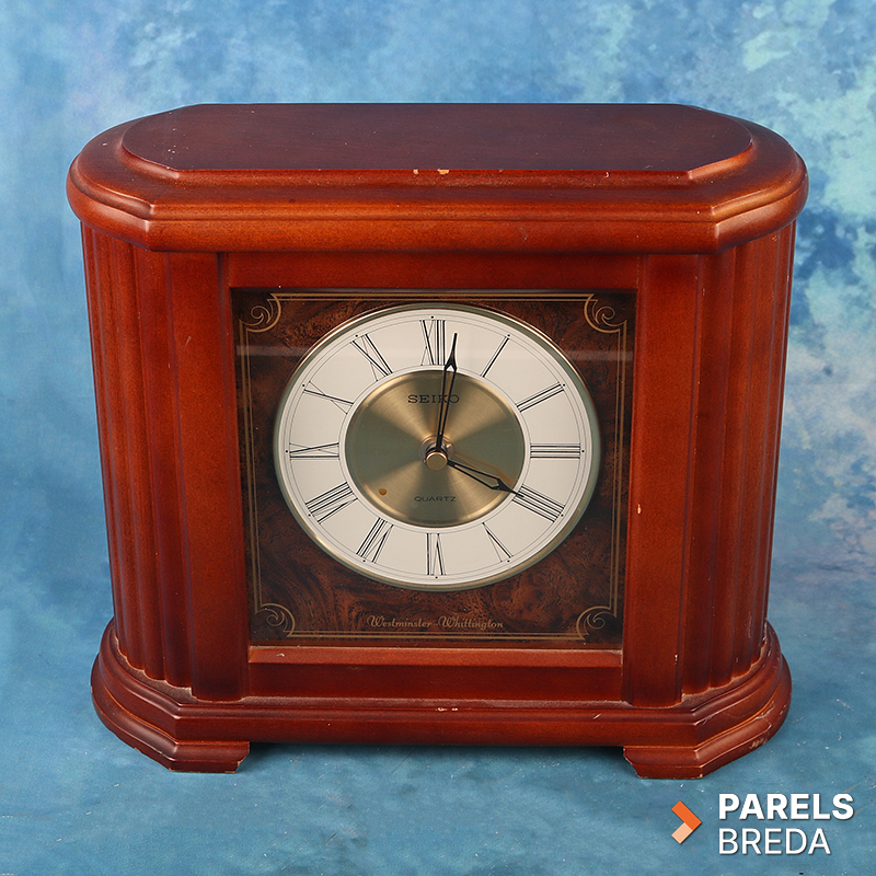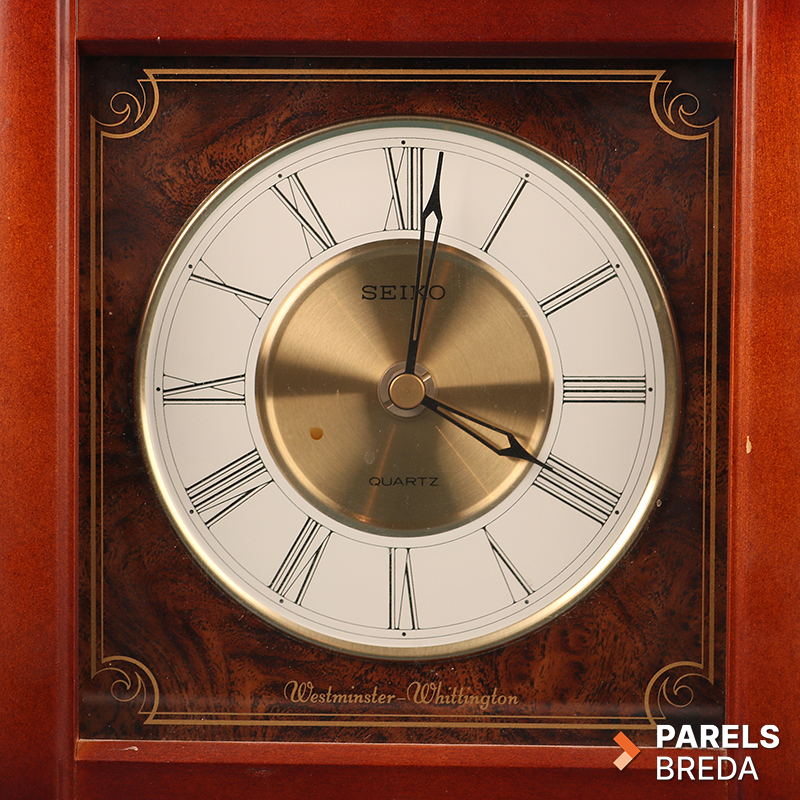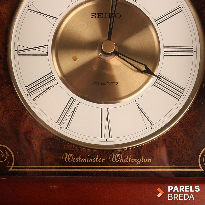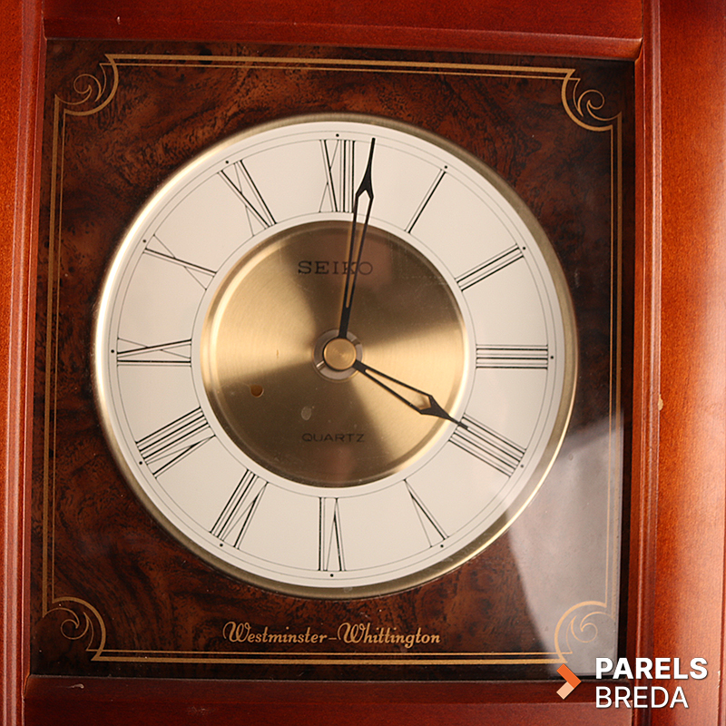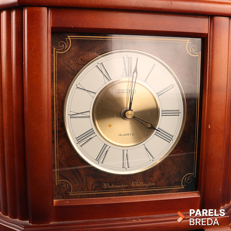 Klassieke Seiko Quartz mantelklok met Westminster‑ en Whittington‑geluid. De klok heeft een houten kast met gefineerde voorzijde en een duidelijk afleesbare wijzerplaat met Romeinse cijfers. Het quartz uurwerk werkt op een D‑batterij en is uitgevoerd met volumeregeling en schakelopties voor dubbele de gong. De kast heeft lichte gebruikssporen, maar is verder in nette staat.