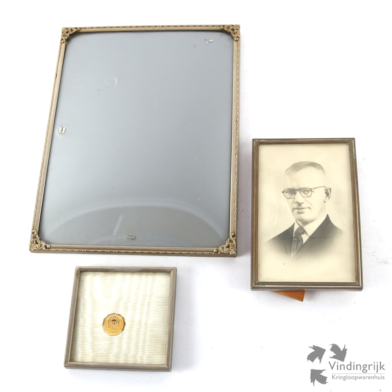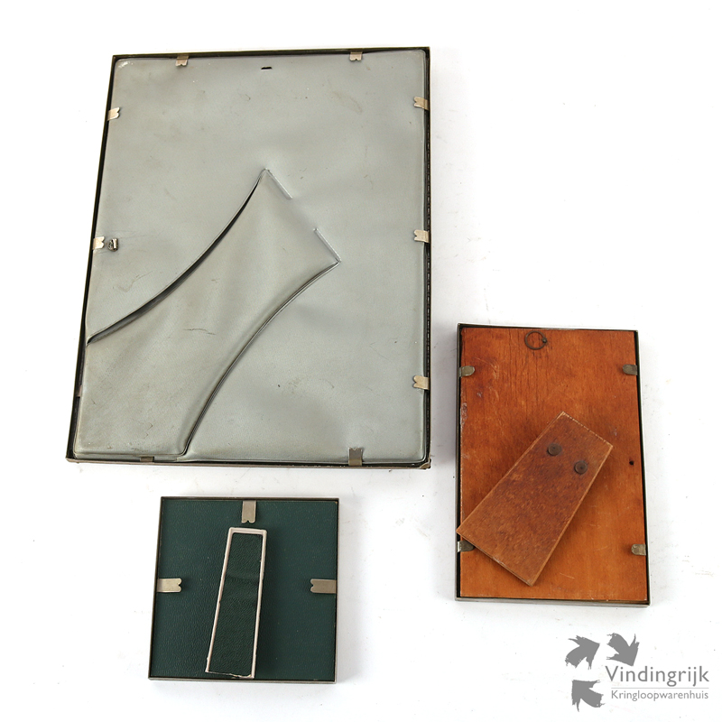 Vintage set van drie fotolijsten van metaal. De lijstjes hebben gebold glas en kunnen zowel staand als liggend gebruikt worden.