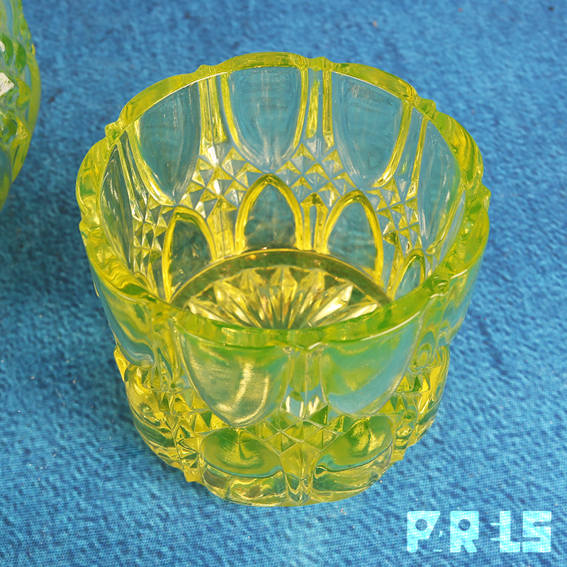 De stukken zijn gemaakt van uraniumglas met een geel/goene kleur.
