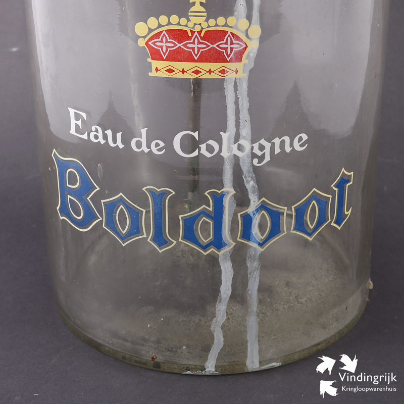 Hier een voor dit doel gemaakte grote toonbankfles voor de Eau de Cologne van Boldoot. Aan de achterkant hoort een slangetje met handpomp; deze ontbreken. Of het mechanisme nog werkt, is niet bekend, zodat geen garantie op de werking wordt gegeven. De fles dateert van 1950. Eau de cologne van Boldoot is overigens nog steeds te koop.