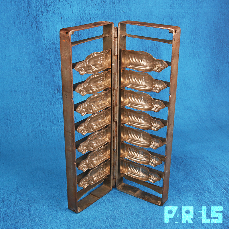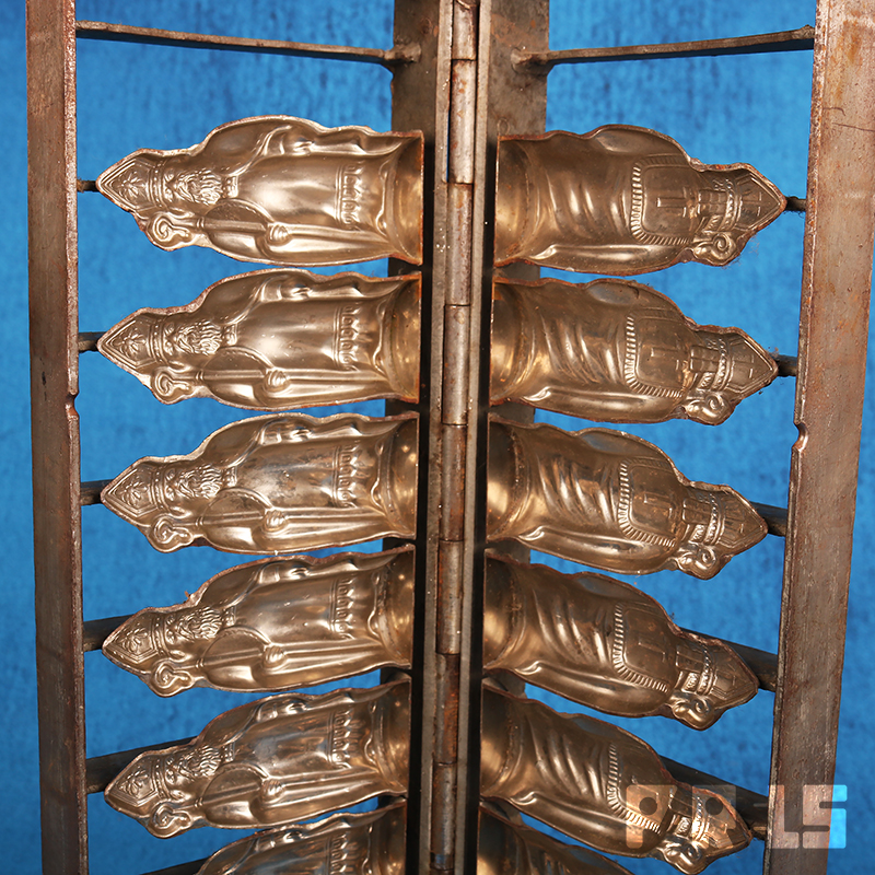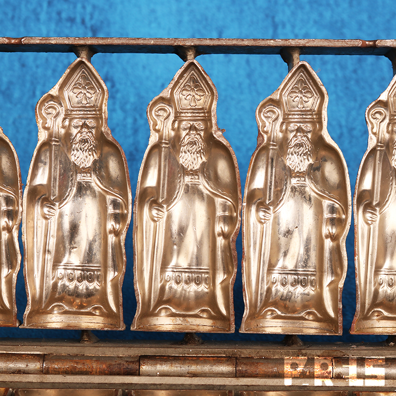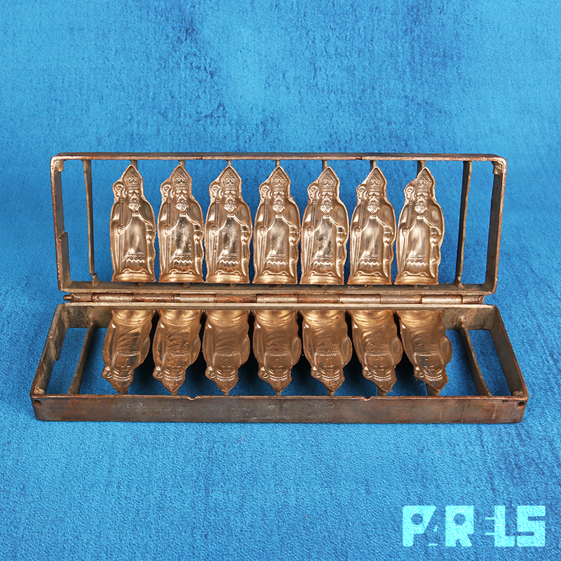 Vintage mal voor het maken van 7 Sinterklaasjes van chocolade of marsepein. De Sinterklazen kunnen naar keus hol of massief gemaakt worden. De twee helften van voor- en achterkant kunnen door de mal dicht te klappen samen worden gevoegd.