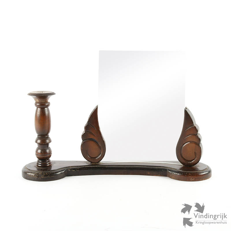 Aan de linkerkant bevindt zich een mooie kandelaar en aan de rechterkant zitten twee gebogen glasplaten waar de foto tussen geplaatst kan worden.