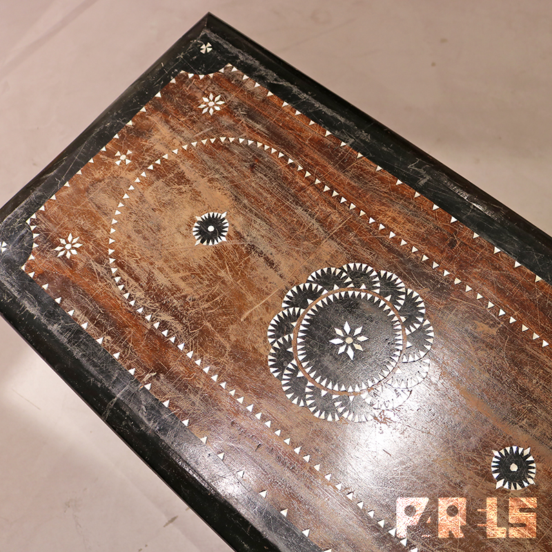 De kist is gemaakt van hout en gedecoreerd met mooie ingelegde parelmoer patronen.