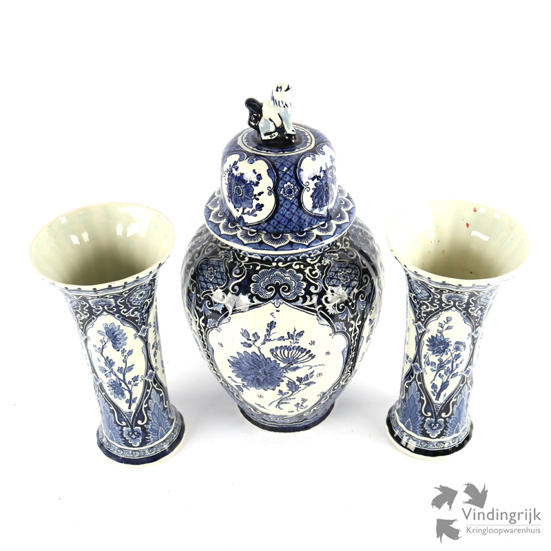 Vintage kaststel van Royal Boch in delftsblauwe kleuren. Het kaststel bestaat uit 2 vazen (1 met miniiem chipje; zie foto) en een pot met deksel.