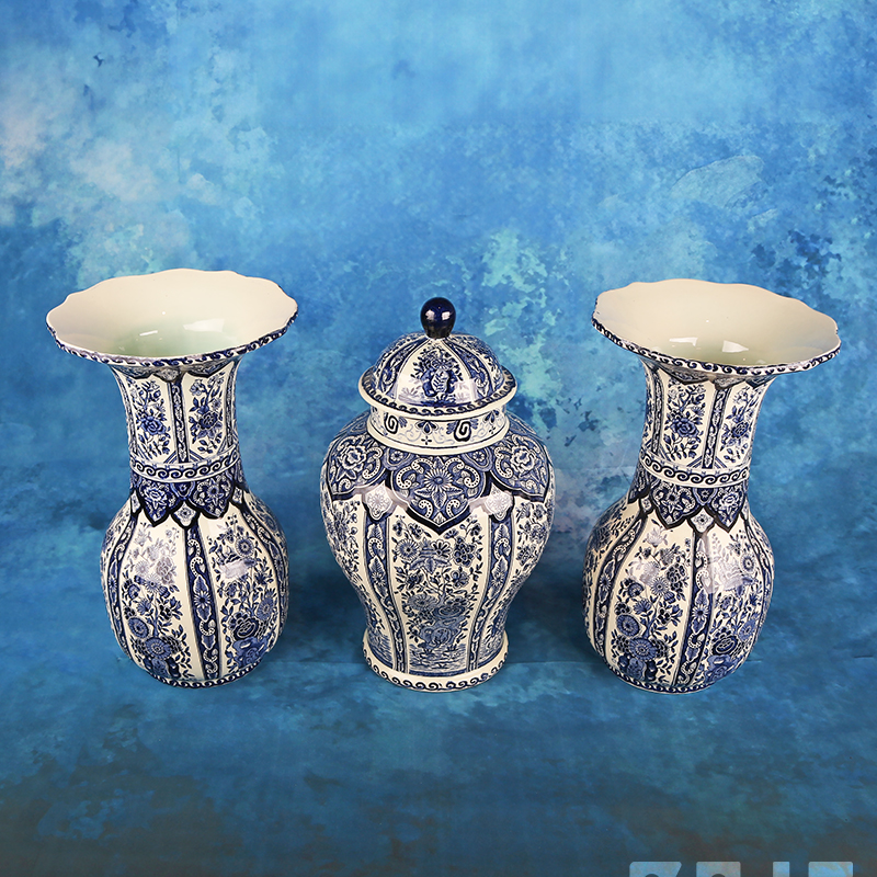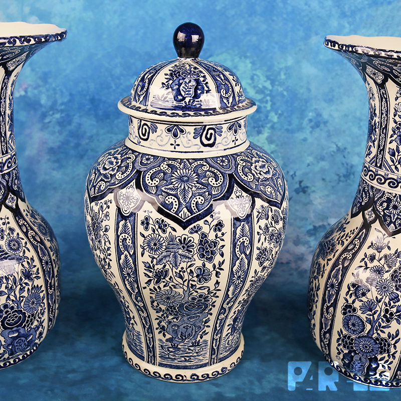Prachtig vintage kaststel van Royal Boch in Deltsblauwe kleuren. Het kaststel bestaat uit 2 vazen en een pot met deksel.