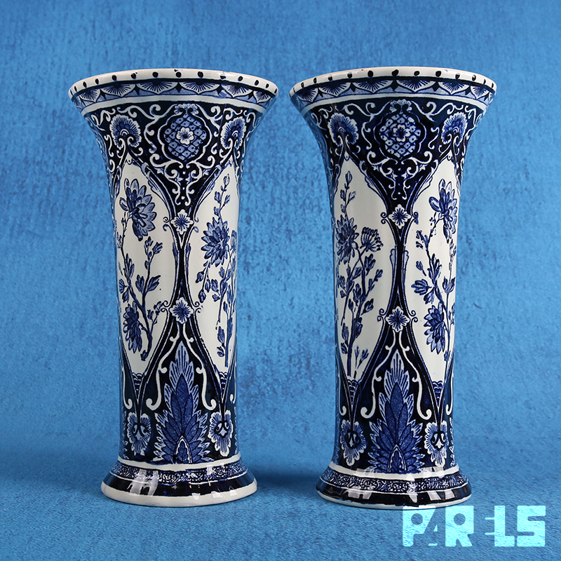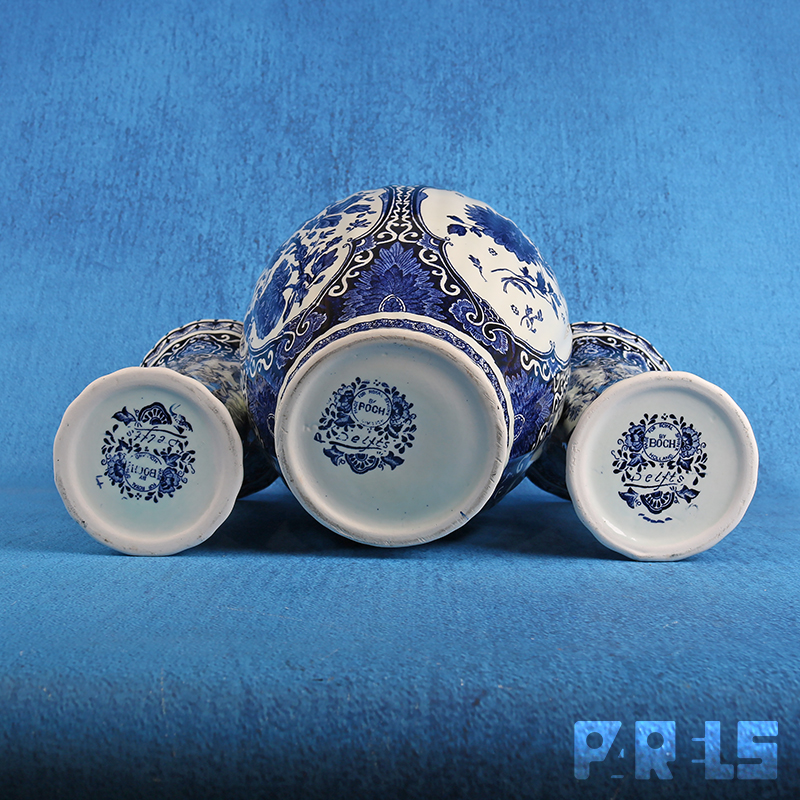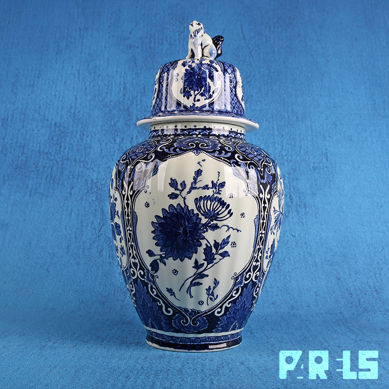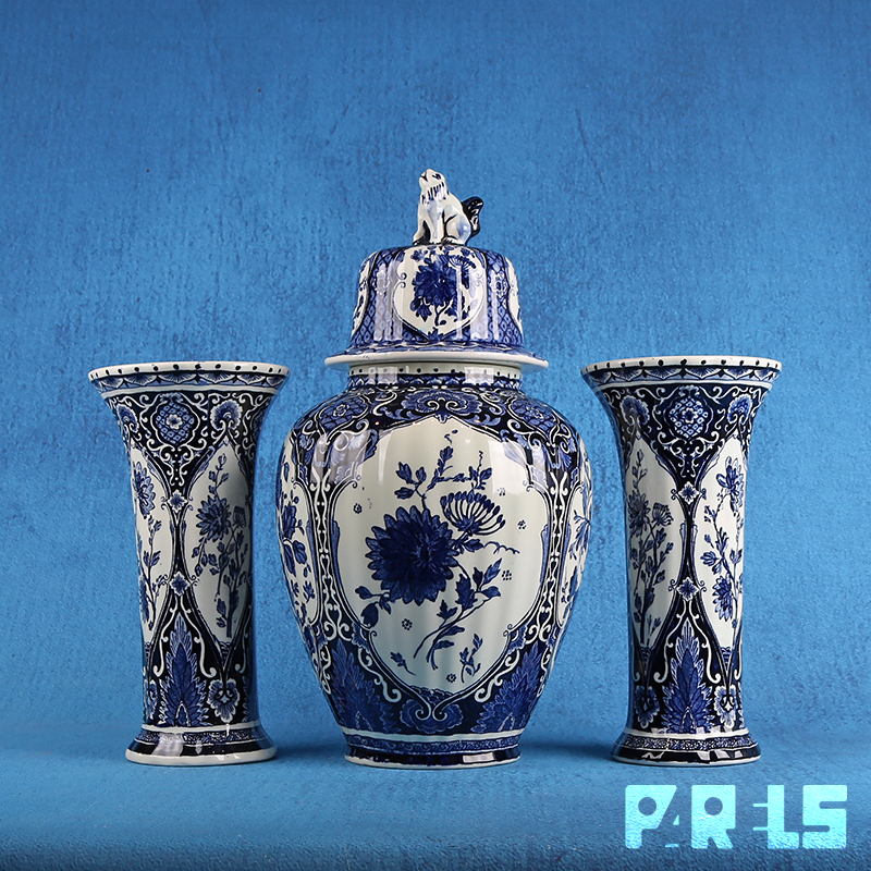 Prachtig vintage kaststel van Royal Boch in delftsblauwe kleuren. Het kaststel bestaat uit 2 vazen en een pot met deksel.