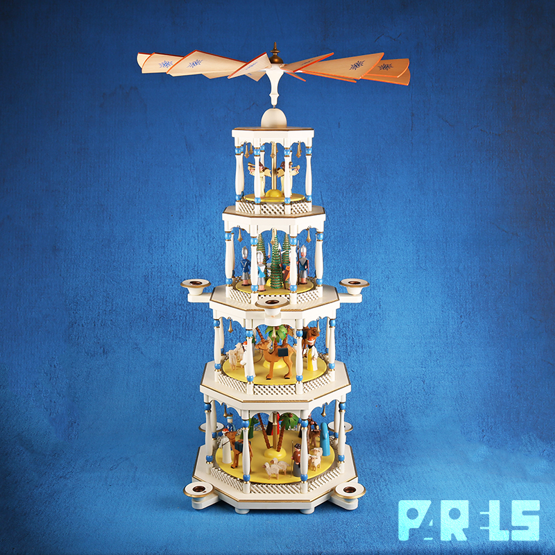 Dit handgemaakte exemplaar is maar liefst 4 verdiepingen hoog. De figuren beelden samen het kerstverhaal uit, ieder figuurtje is afzonderlijk gelakt.