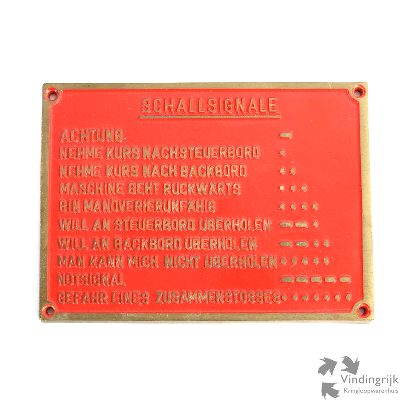 Vintage plaquette van gietijzer met de weergave van 10 signalen in geluid voor op het schip die op het dek hing. Zo is er het algemene waarschuwingssignaal, wending naar stuur- of bakboord, inhalen aan stuur- of bakboord, achteruit varen, het noodsignaal en nog drie andere signalen.