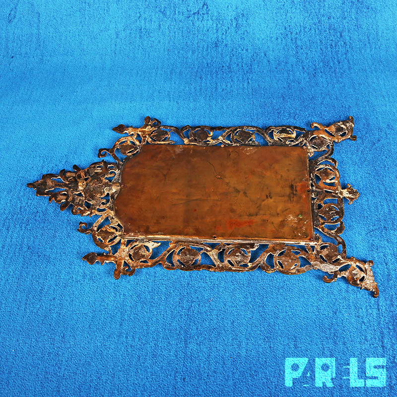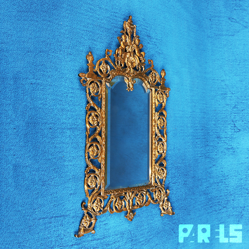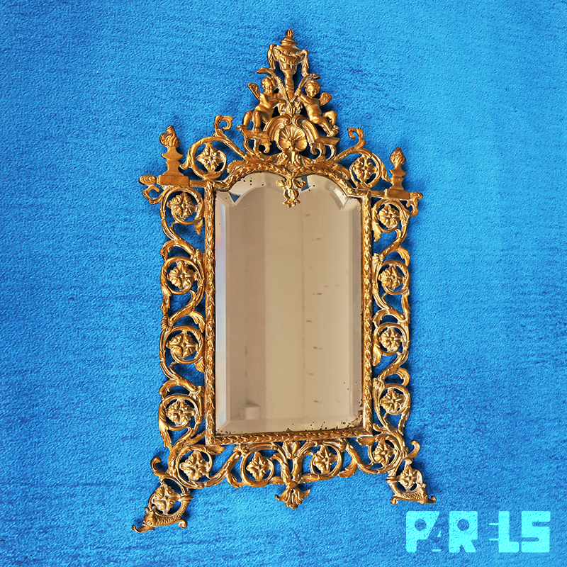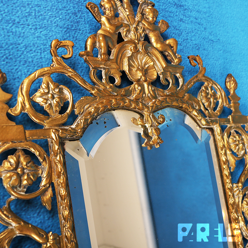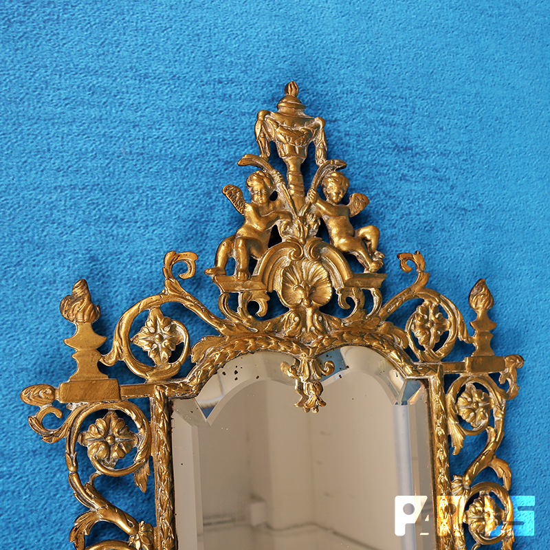 De spiegel is fraai facet geslepen en zit in een prachtige koperen omlijsting in barokstijl welke rijkelijk is gedecoreerd met allerlei ornamenten, bloemmotieven en bovenaan 2 engelen.
