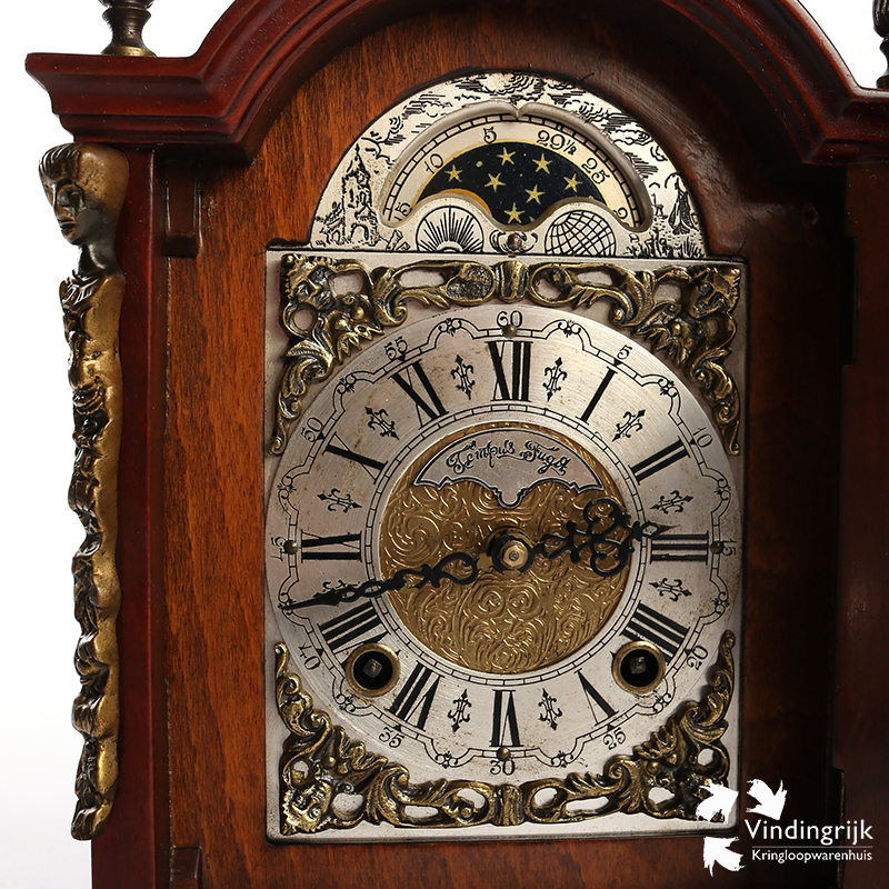 De klok is in goed werkende staat en heeft een mooi gegraveerd mechaniek met maanaanduiding.