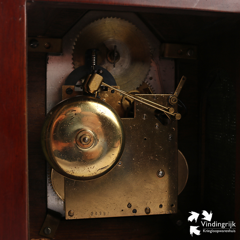 Prachtige klassieke tafelklok van het merk Wuba Warmink met mahoniehouten kast en tweetonig slagwerk op de hele en halve uren.