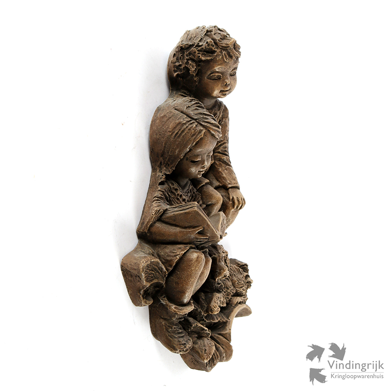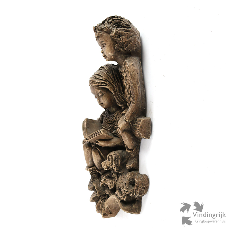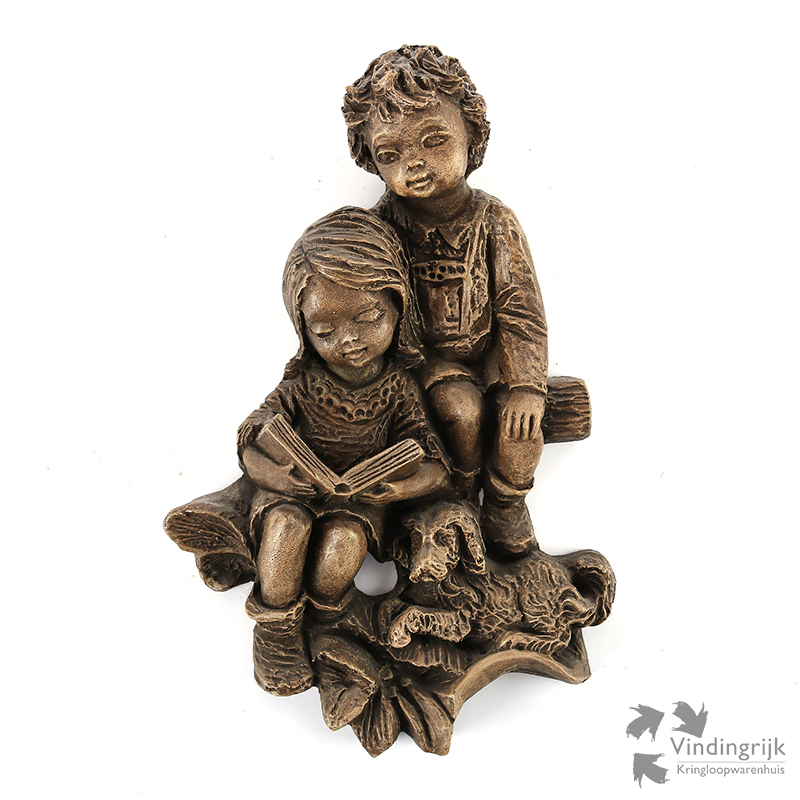 Het betreft een voorstelling van een jongen, meisje met boek en een hond.