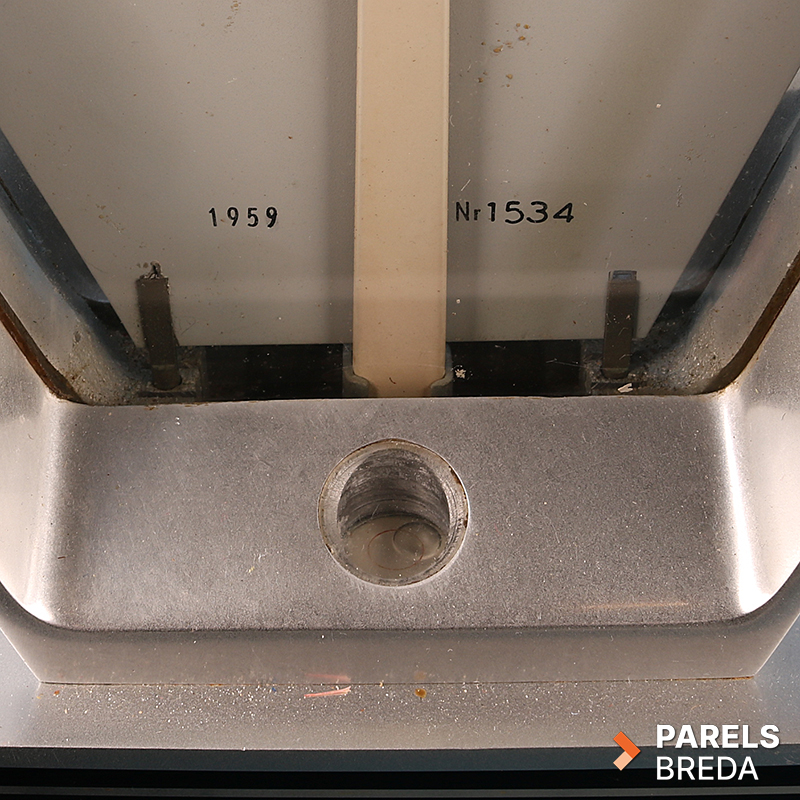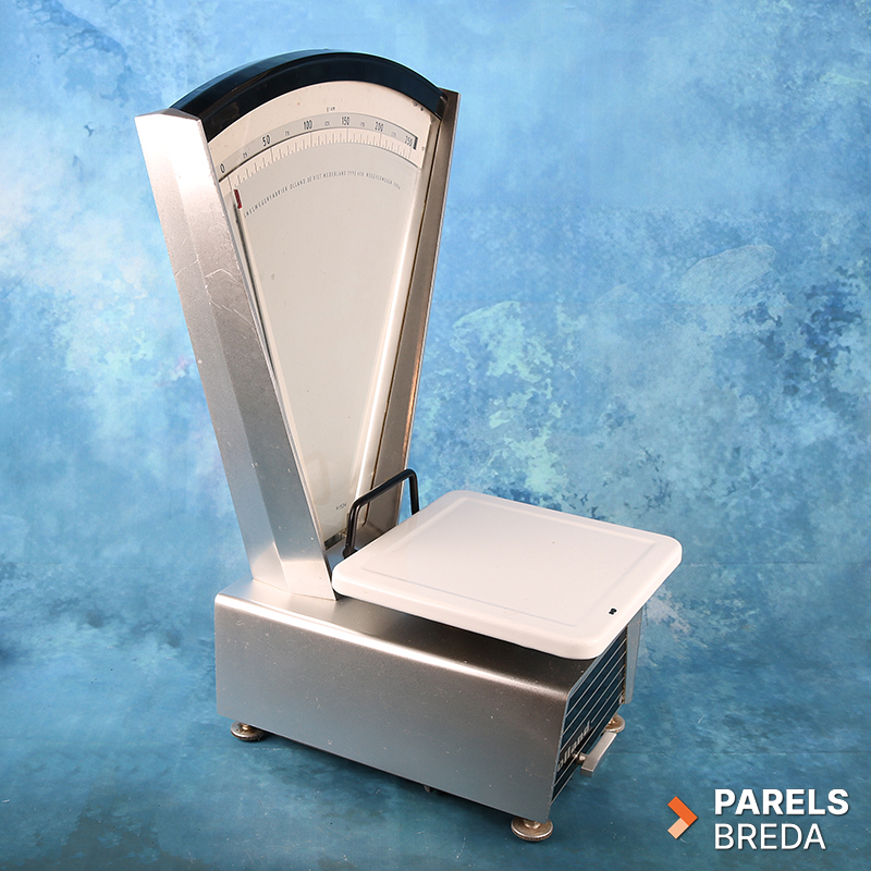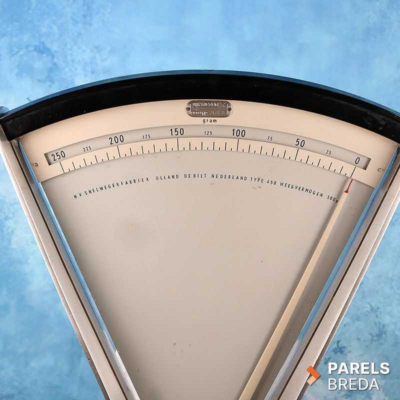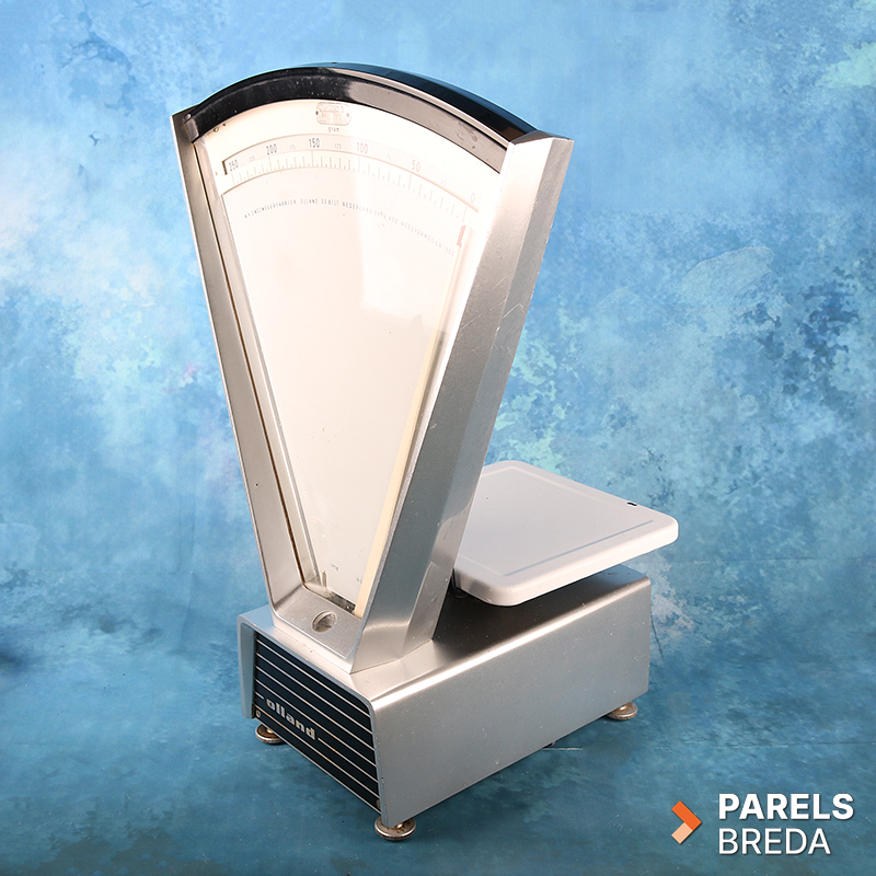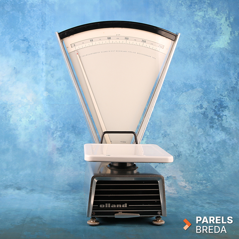 Vintage winkelweegschaal van het merk Olland uit 1959, geproduceerd door N.V. Snelwegerfabriek Olland in De Bilt. Dit analoge model type 458 is uitgevoerd met een grote afleesplaat en een stevig metalen onderbouw. Het plateau is uitgevoerd in emaille. De schaalverdeling loopt tot 250 gram en wordt weergegeven via een nauwkeurig mechanisch balanssysteem.