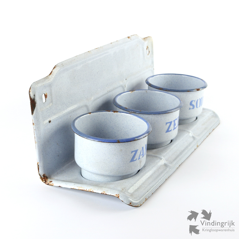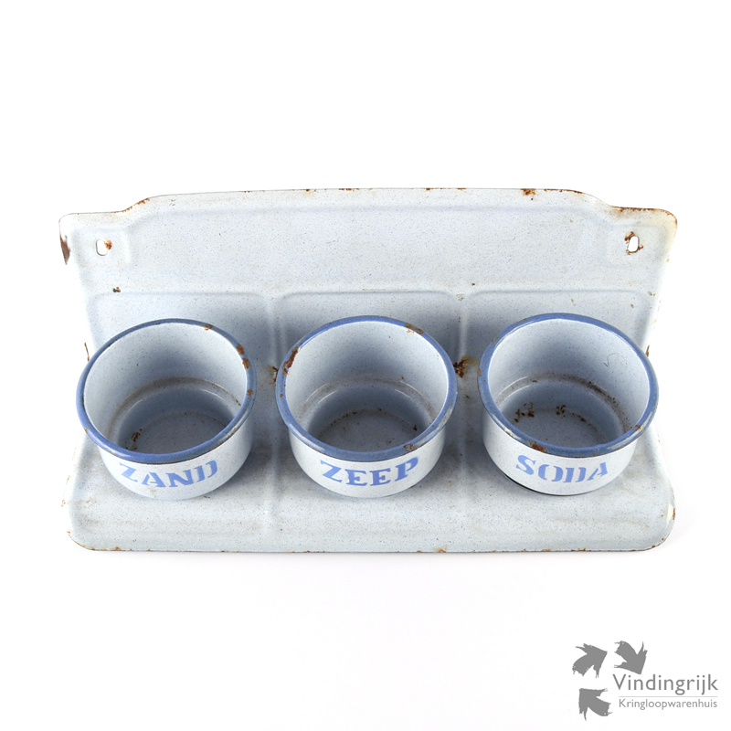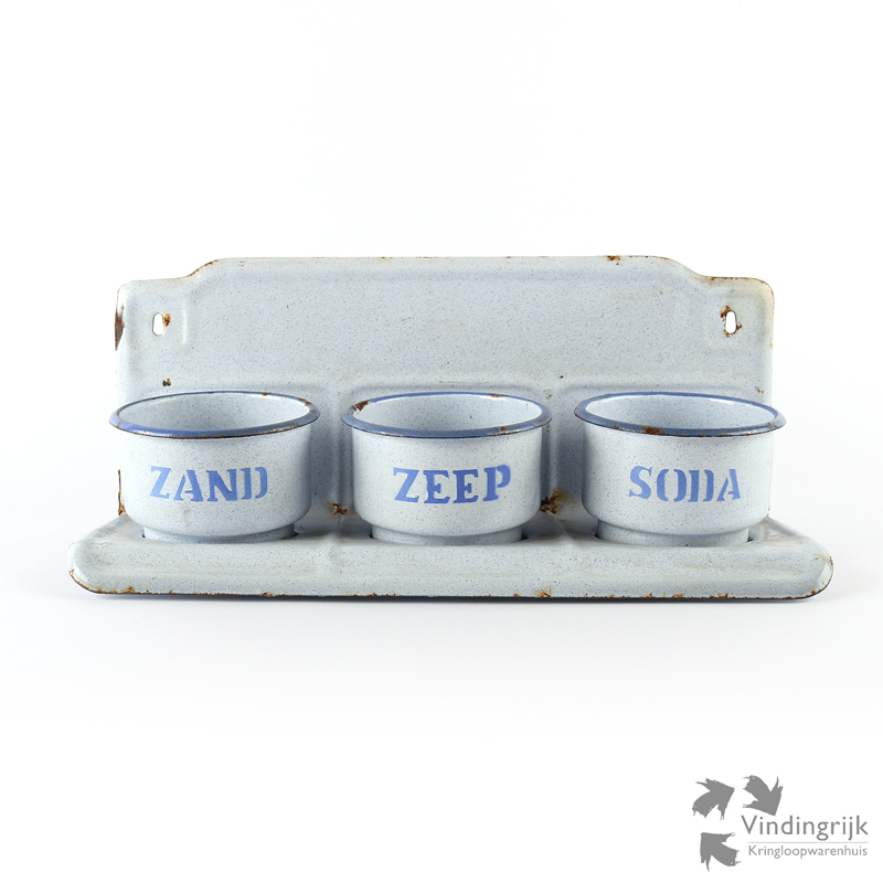 Vroeger werden zand zeep en soda gebruikt bij de schoonmaak. De zachte groene zeep werd bijna overal voor gebruikt: de was, de afwas en de vloeren. Vaak werd dit nog vermengt met soda voor een beter resultaat. Voor extreem vieze dingen, zoals aangekoekte pannen werd er wat zand door gedaan. In ontelbare keukens zal vroeger dus een Zand Zeep Soda rekje hebben gehangen. Hier een rekje met bakjes in mooi gespikkeld lichtblauw.