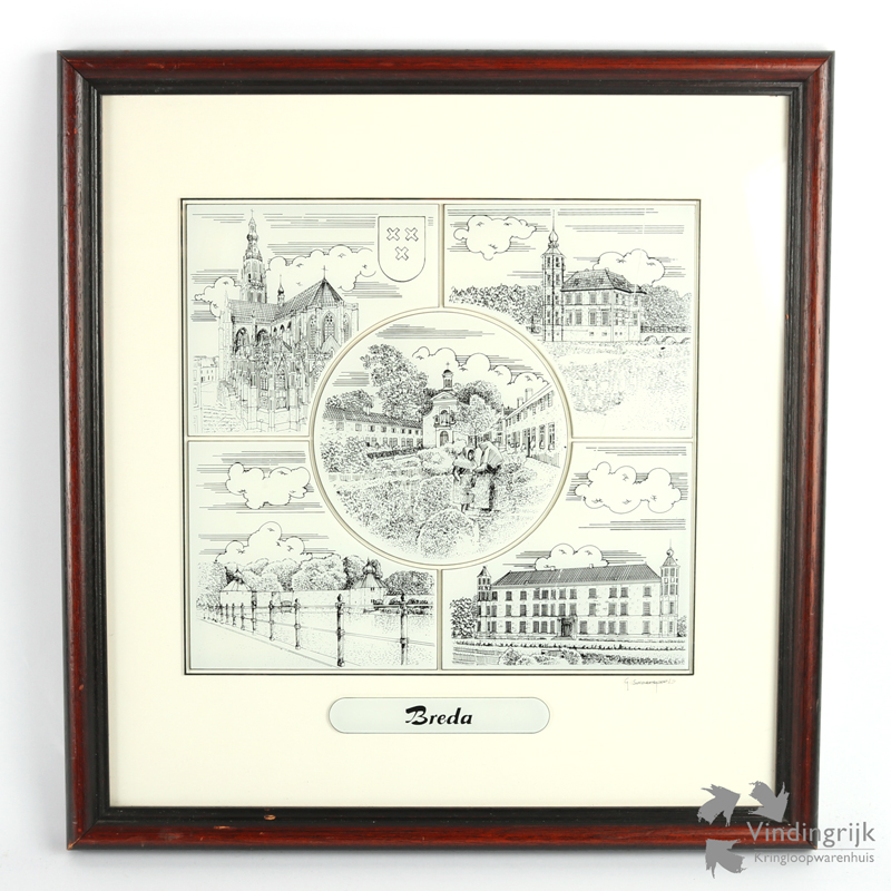 Collage in glaskunst met karakteristieke gebouwen uit de stad Breda met rond in het midden het Begijnhof. De collage is gemaakt door Gerard Swaenepoel in samenwerking met glasatelier Decor Art. De vijf gravures zijn afzonderlijk met 18-karaats goud omrand alsook het rechthoekige geheel in passe-partout.