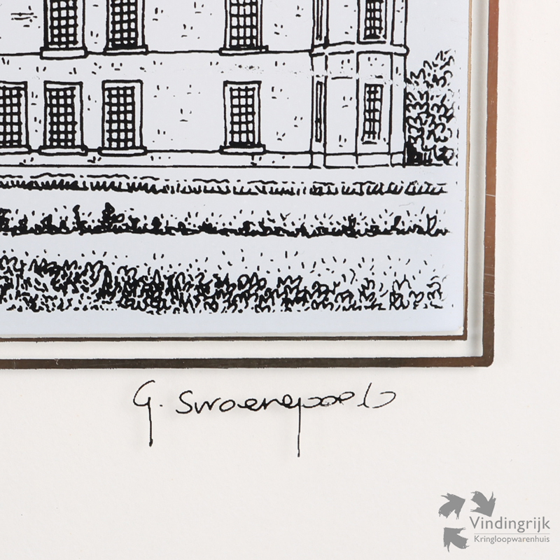 Het werk zit in een houten lijst achter glas en is door de kunstenaar gesigneerd op de glasplaat in de lijst.