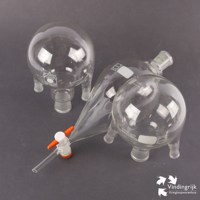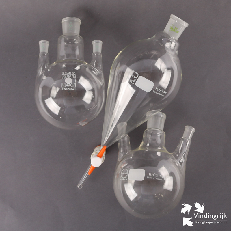 Set laboratorium glaswerk Duran bestaand uit twee gelijke objecten met 3 openingen en een toelopende kolf met een kraantje. Het glaswerk, alle voor 1000 ml is gemaakt door Schott in Duitsland.